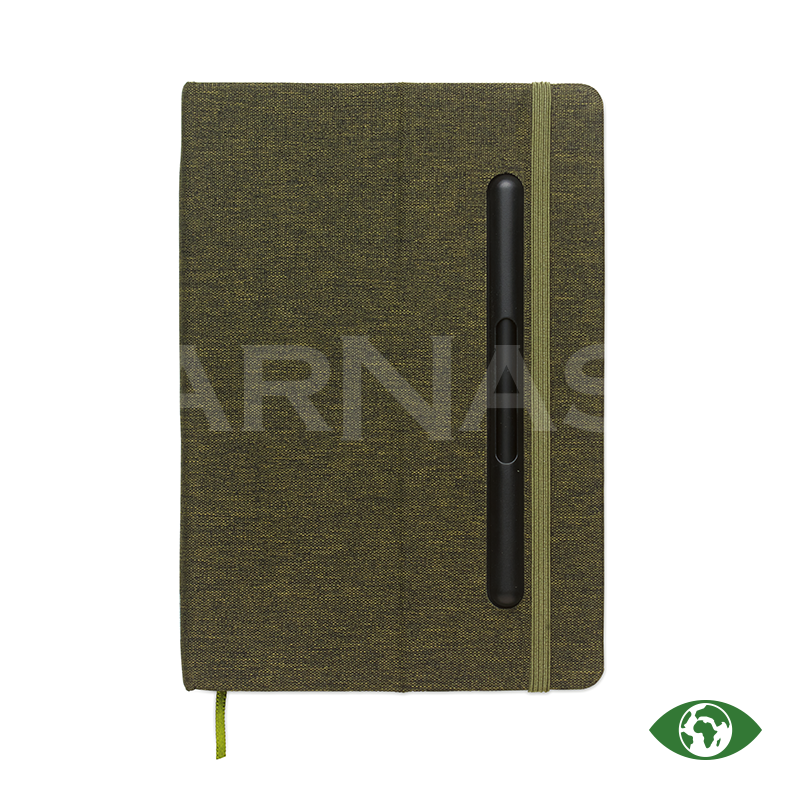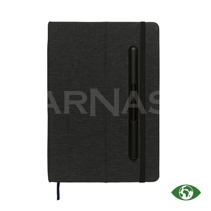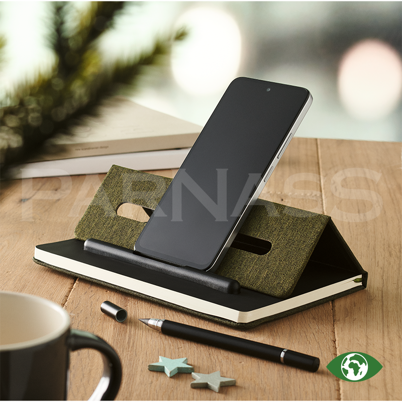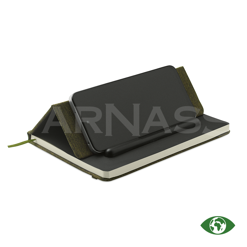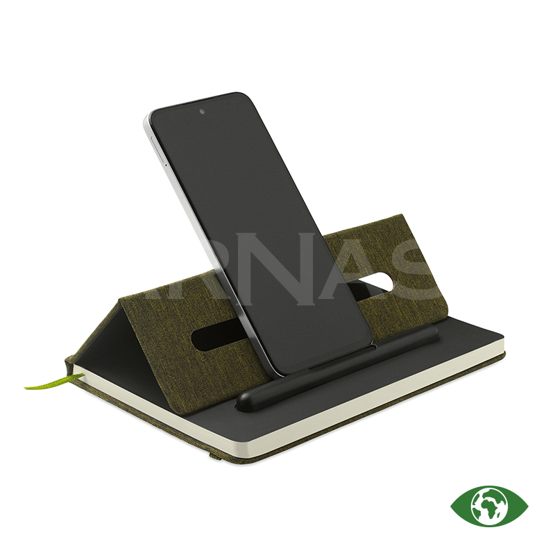 A5 piezīmju bloks ar cietajiem vākiem no RPET un integrētu telefona turētāju. Komplektā iekļauta 2-in-1 ABS pildspalva – beztintes un klasiskā lodīšu pildspalva. Blokam ir 96 līniju lapas no pārstrādāta papīra.