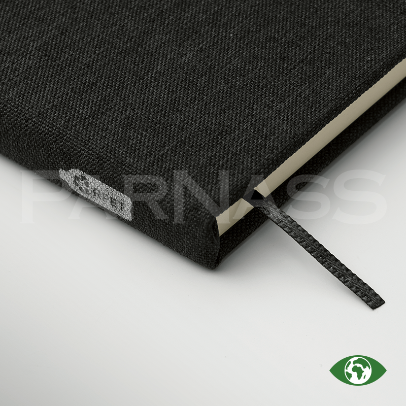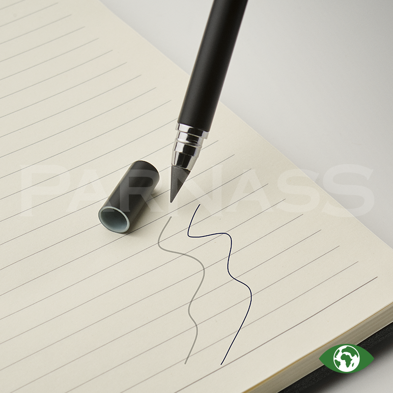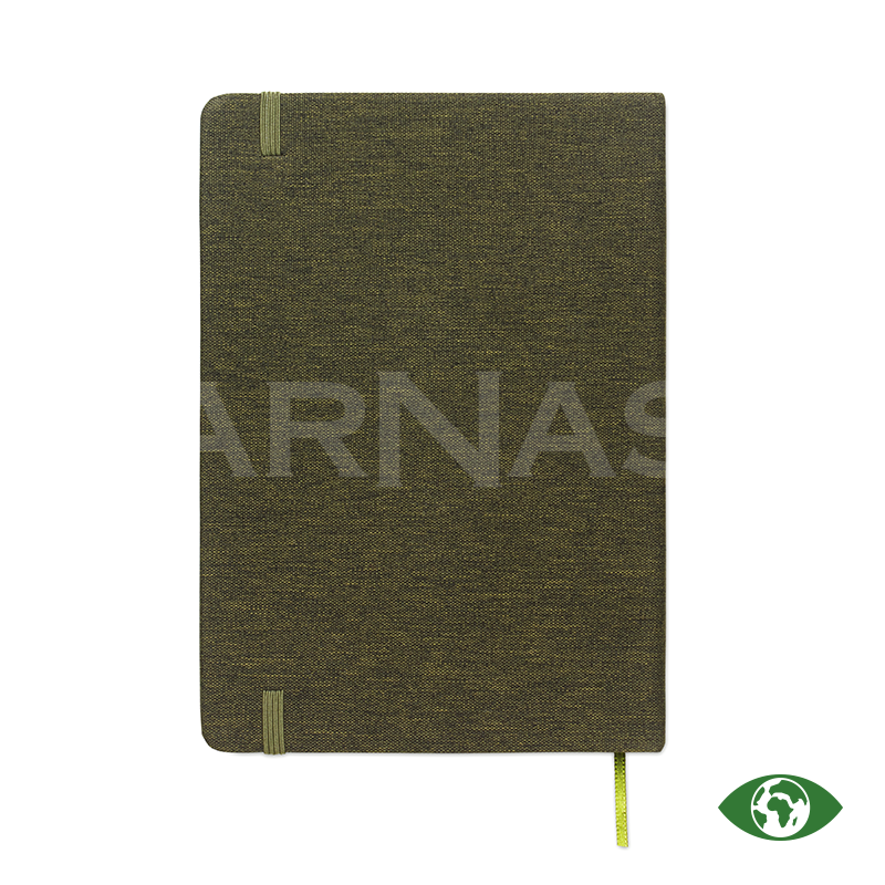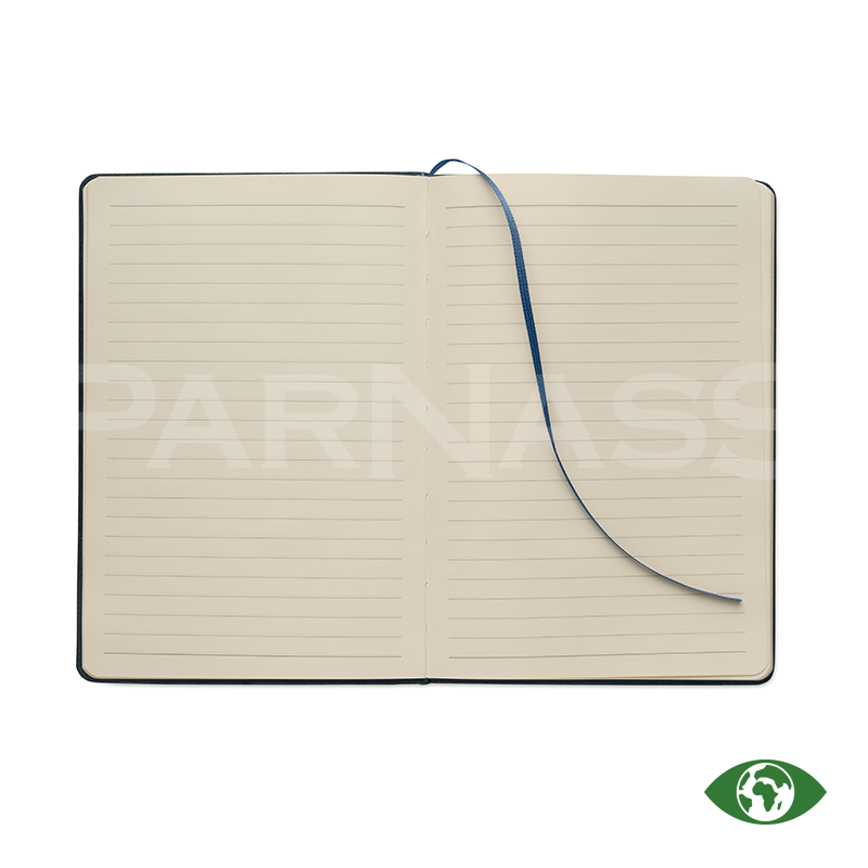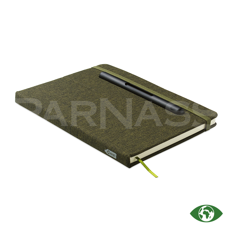 A5 piezīmju bloks ar cietajiem vākiem no RPET un integrētu telefona turētāju. Komplektā iekļauta 2-in-1 ABS pildspalva – beztintes un klasiskā lodīšu pildspalva. Blokam ir 96 līniju lapas no pārstrādāta papīra.