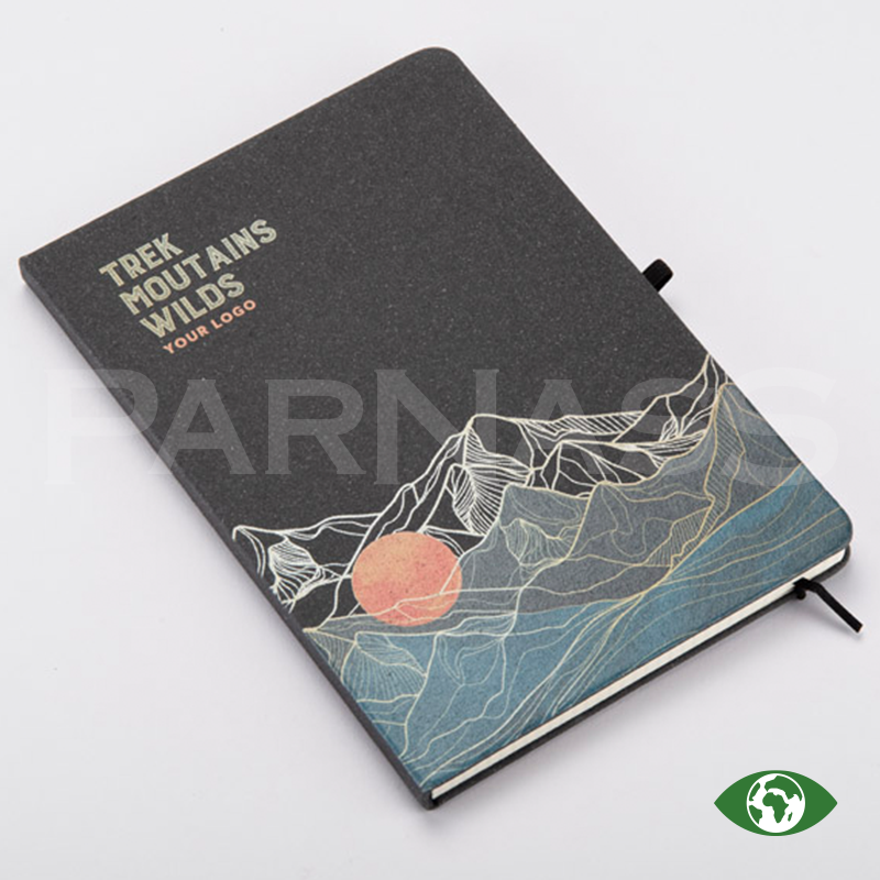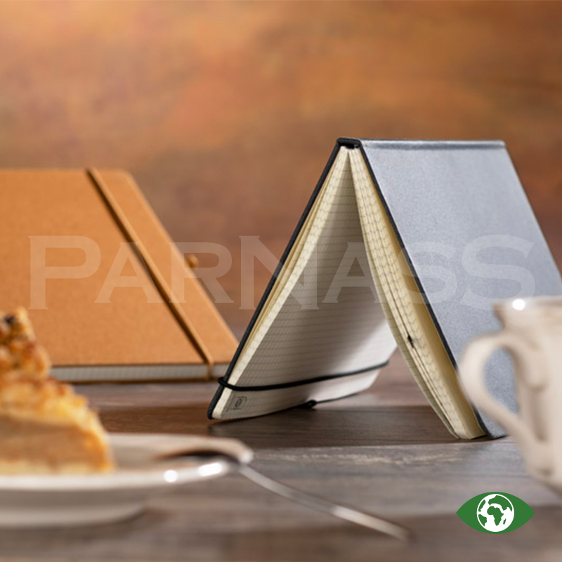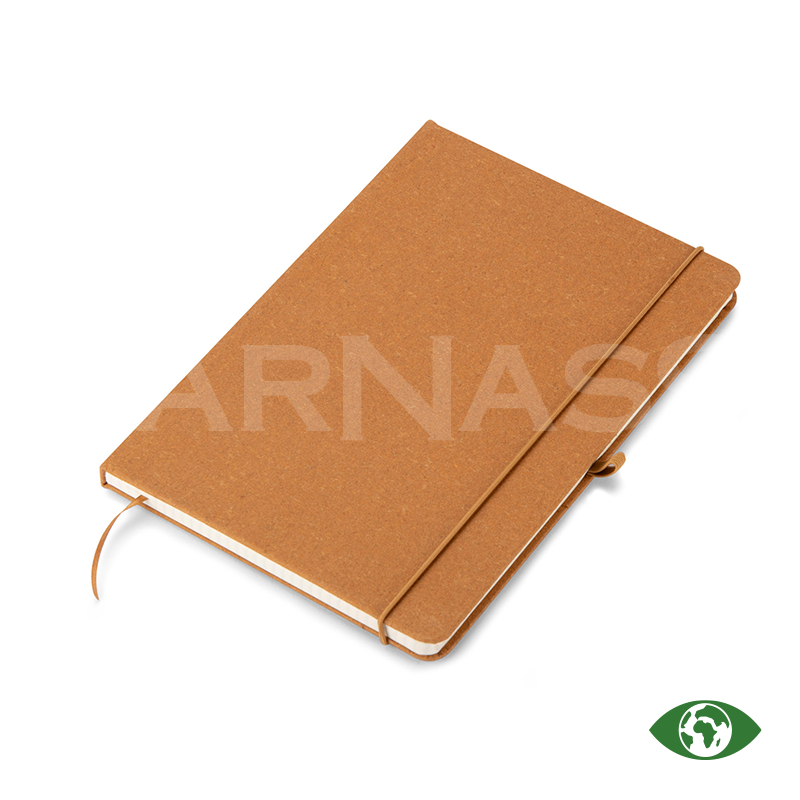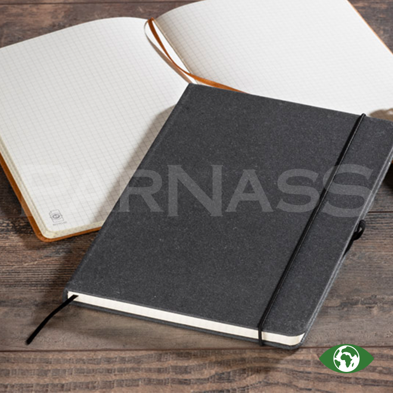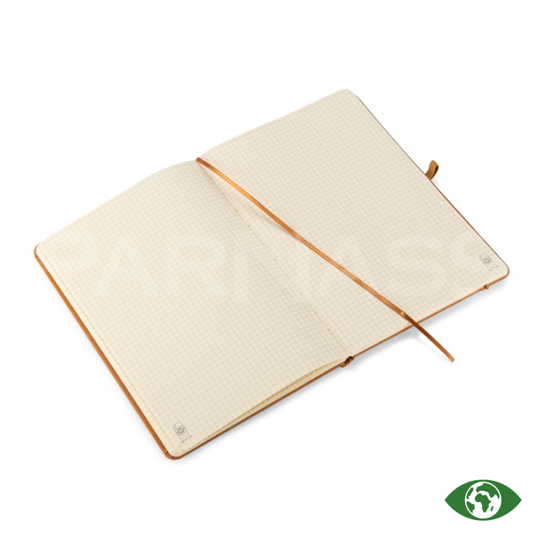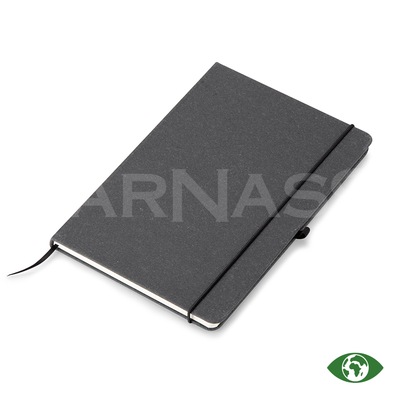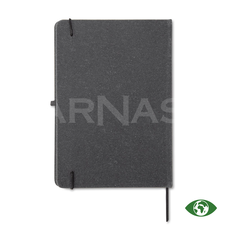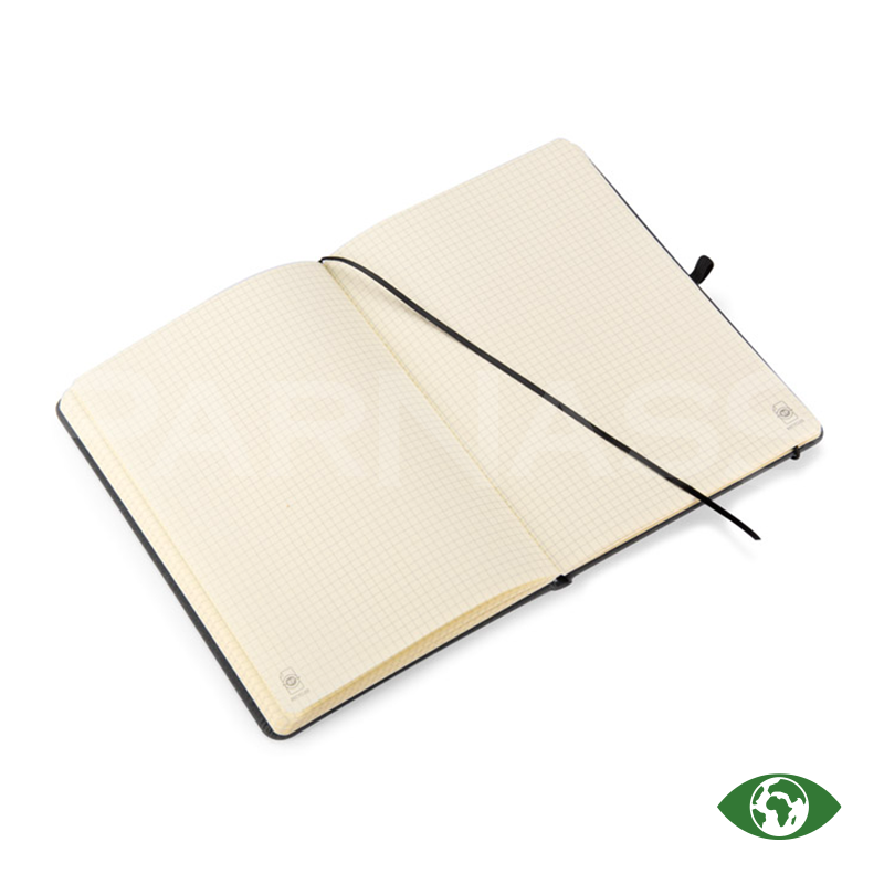 A5 piezīmju bloks ar 80 rūtiņu lapām no pārstrādāta papīra un cieta vāka no pārstrādāta PU materiāla ar elastīgu gumijas aizdari.