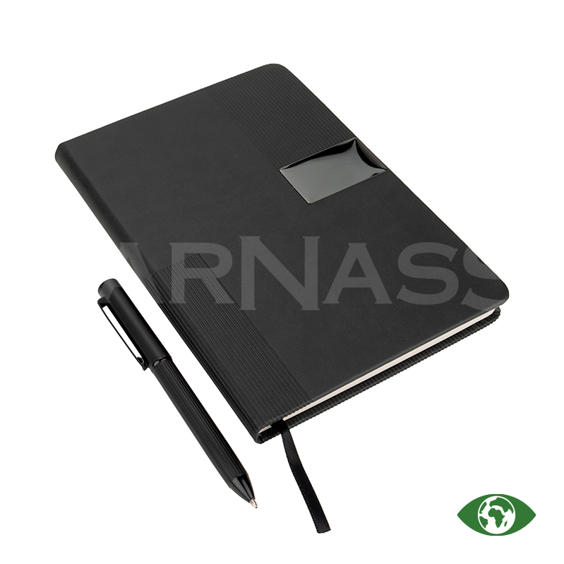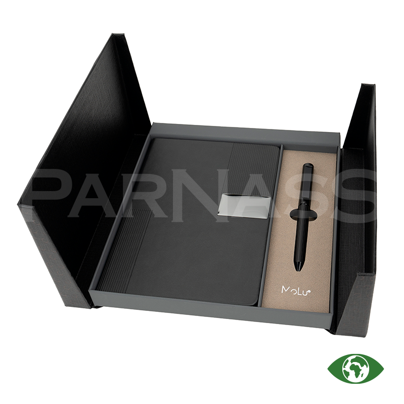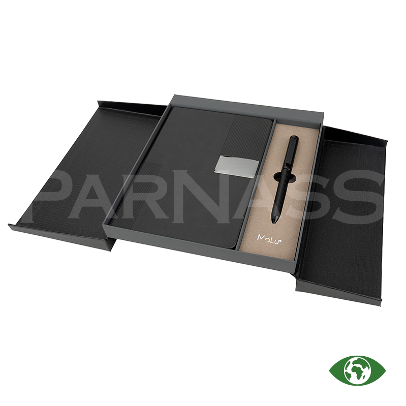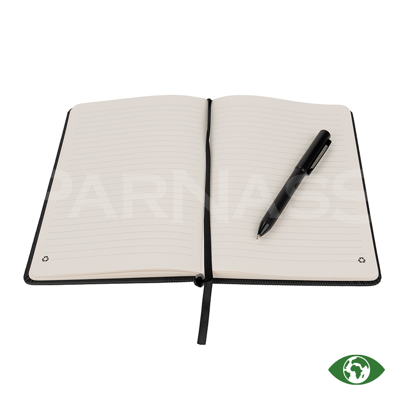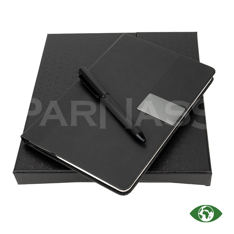 Komplekts ar piezīmju bloku ar 100 pārstrādāta papīra līniju lapām un ergonomisku pildspalvu. Ideāli piemērots kā biznesa dāvana, iepakots reprezentablā kastē. Pildspalvai ir zila tinte.