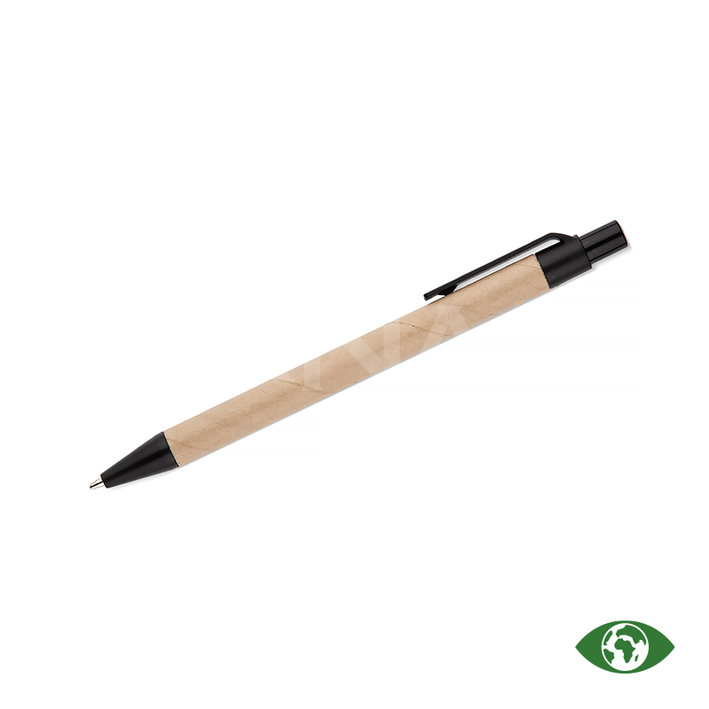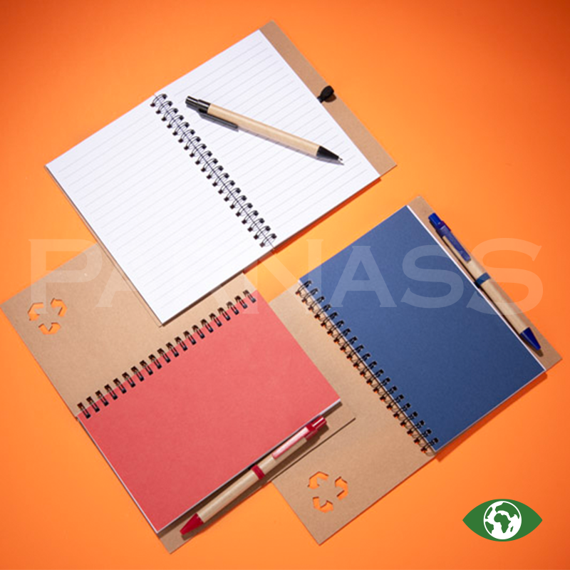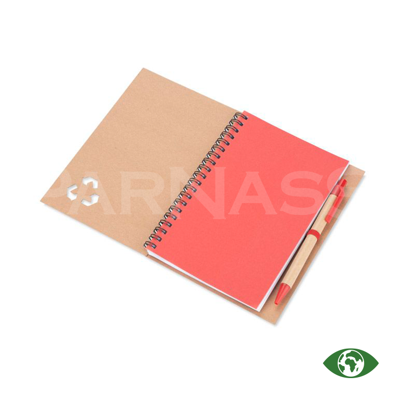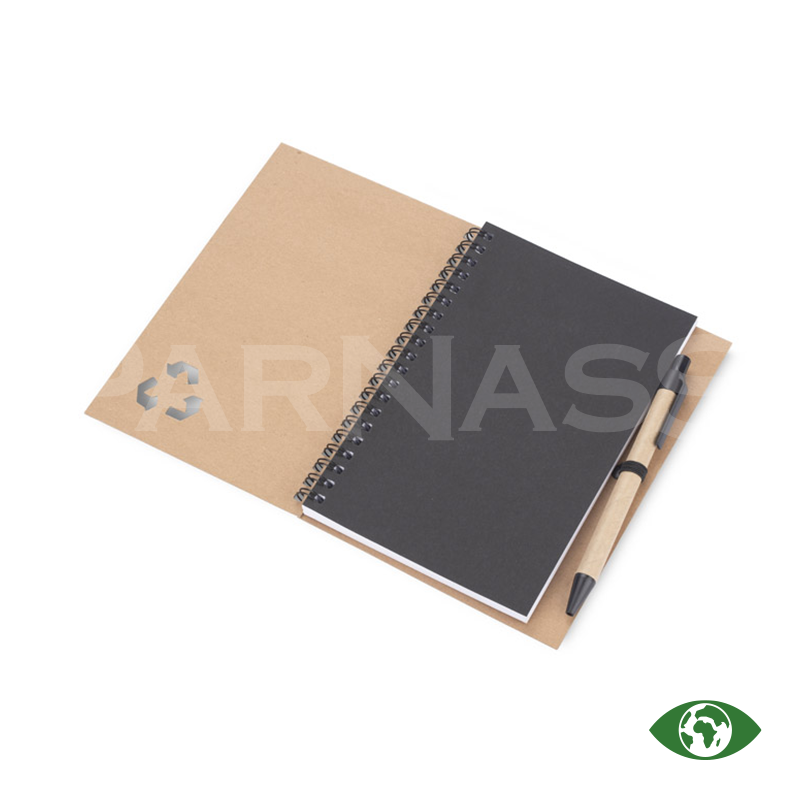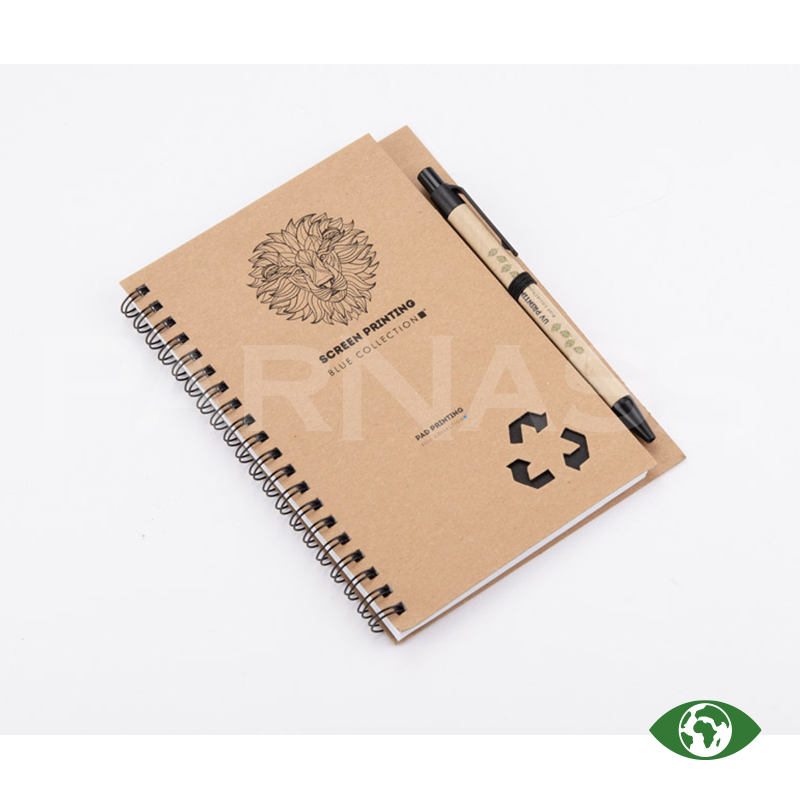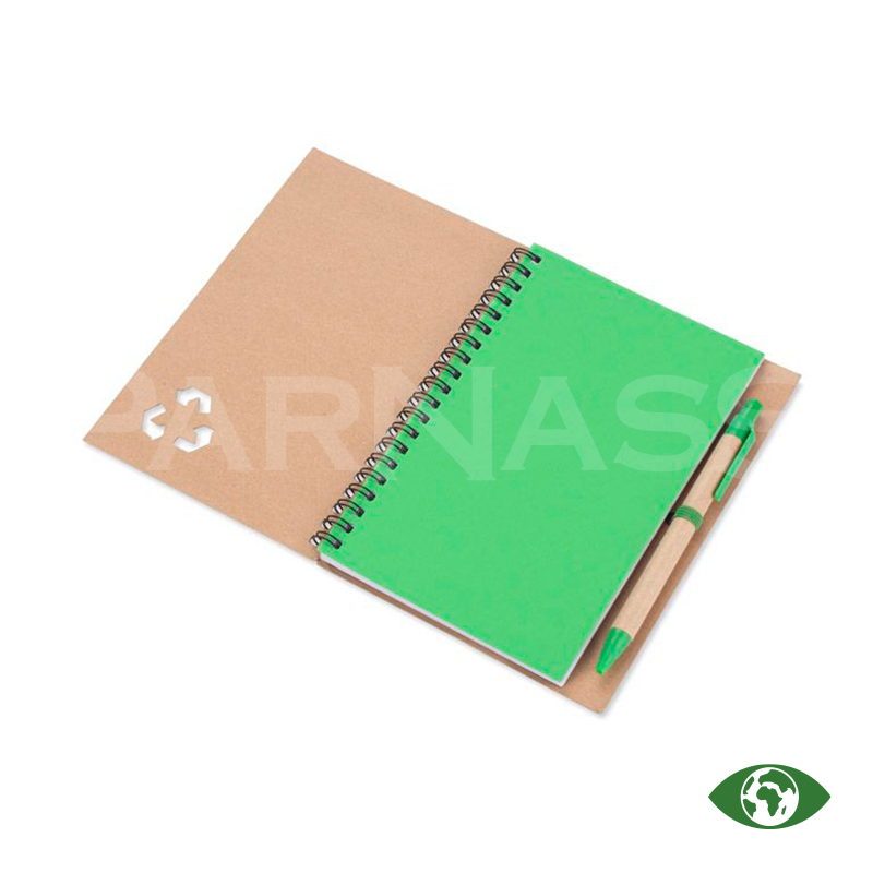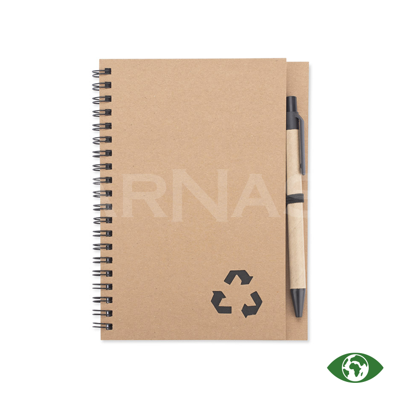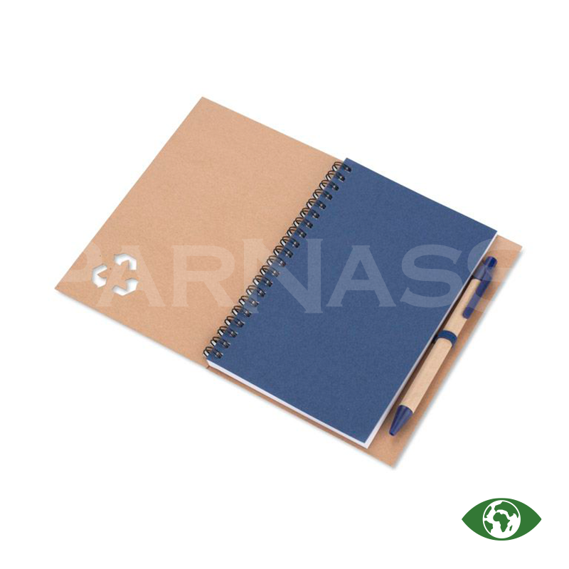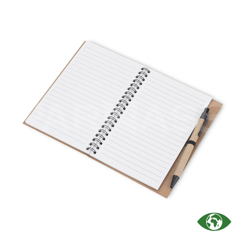 Spirālveida piezīmju bloks ar papīra vāku un lodīšu pildspalva ar papīra korpusu un zilu tinti. Blokā ir 70 līniju lapas.