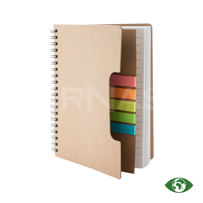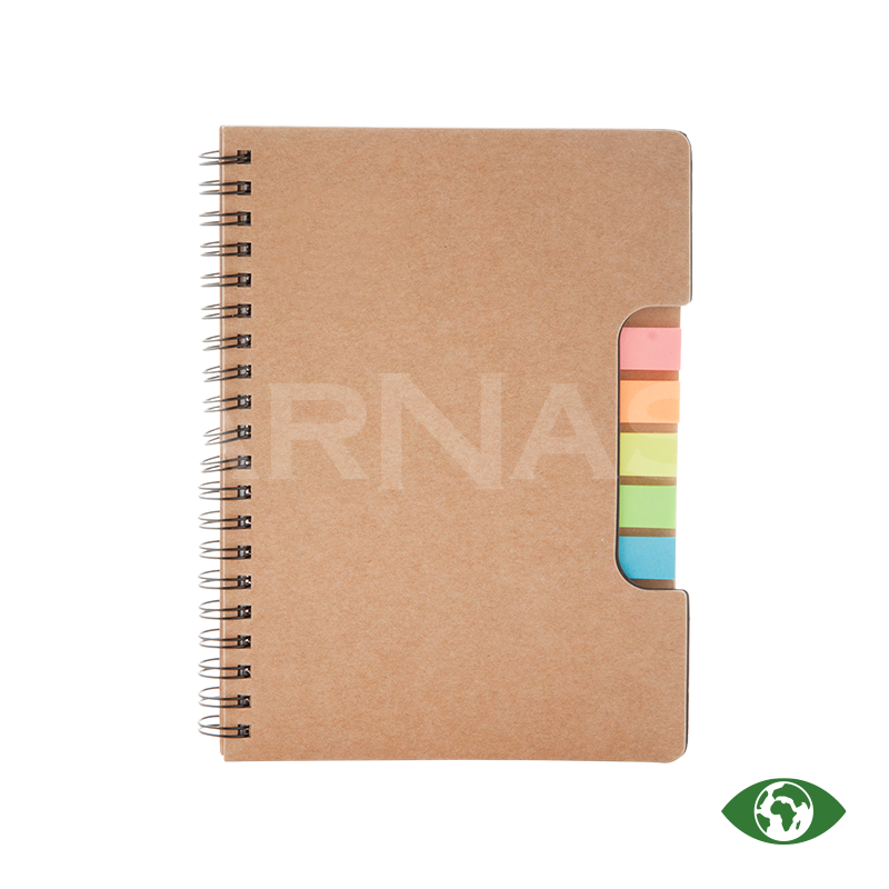 Spirālveida piezīmju bloks no pārstrādāta papīra ar 60 līniju lapām un līmlapiņu marķieriem (5 × 25 gab.).