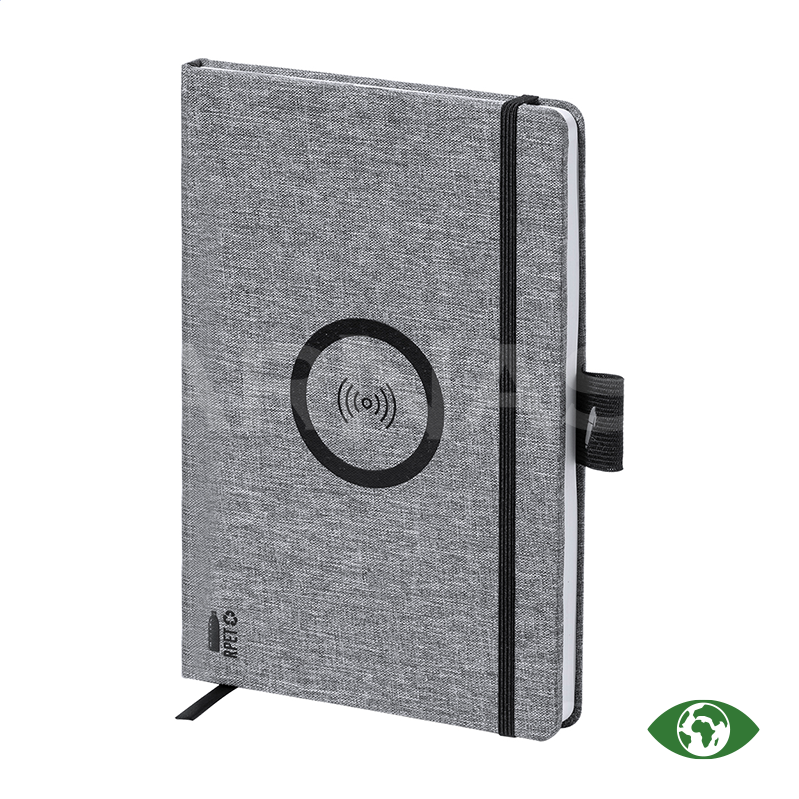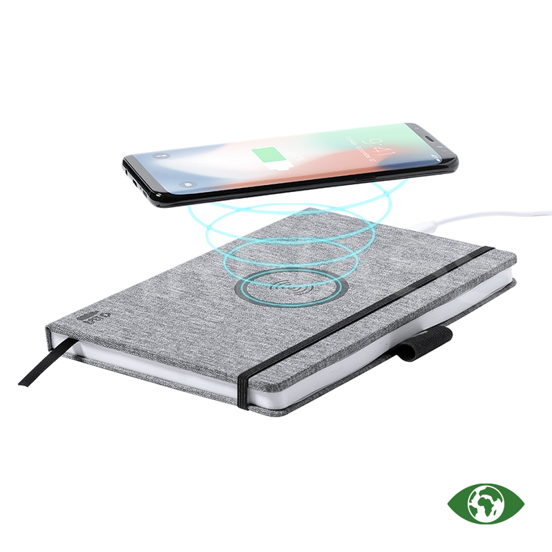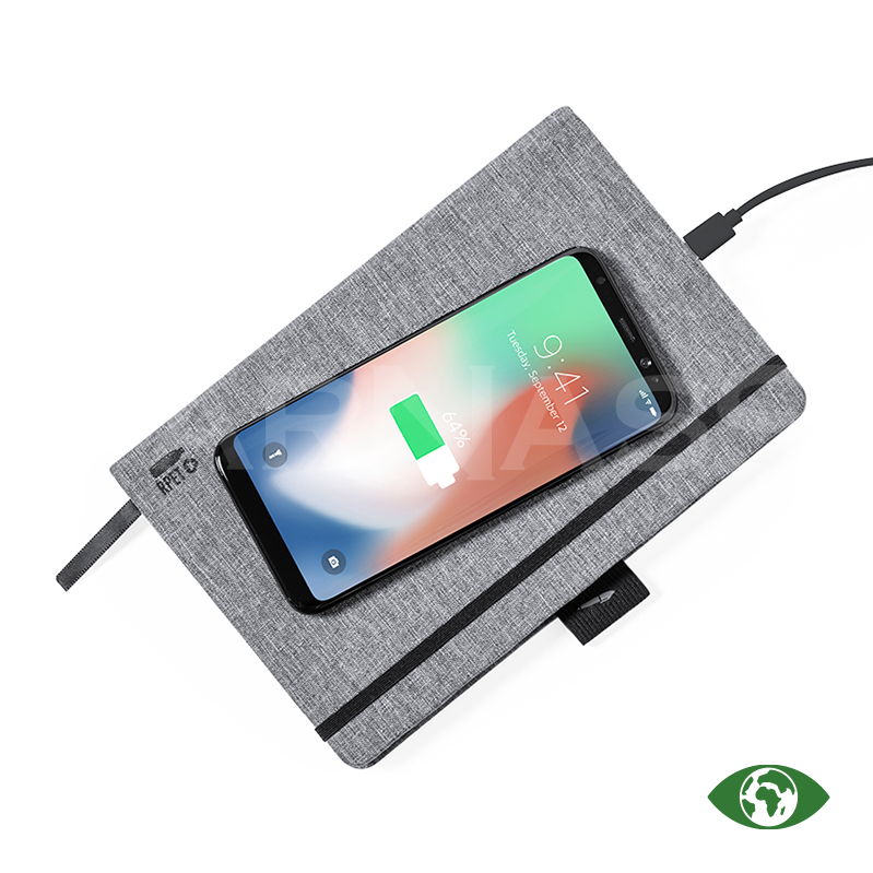 A5 piezīmju bloks ar RPET poliestera vāku un iebūvētu 10W bezvadu ātro lādētāju. 80 līniju lapas, komplektā USB uzlādes kabelis.