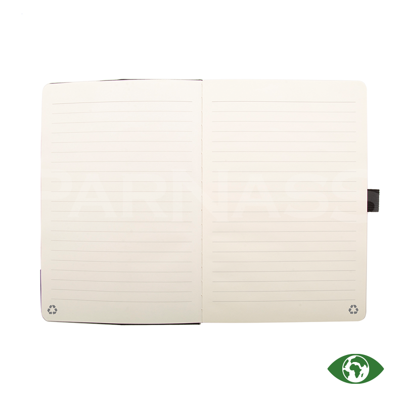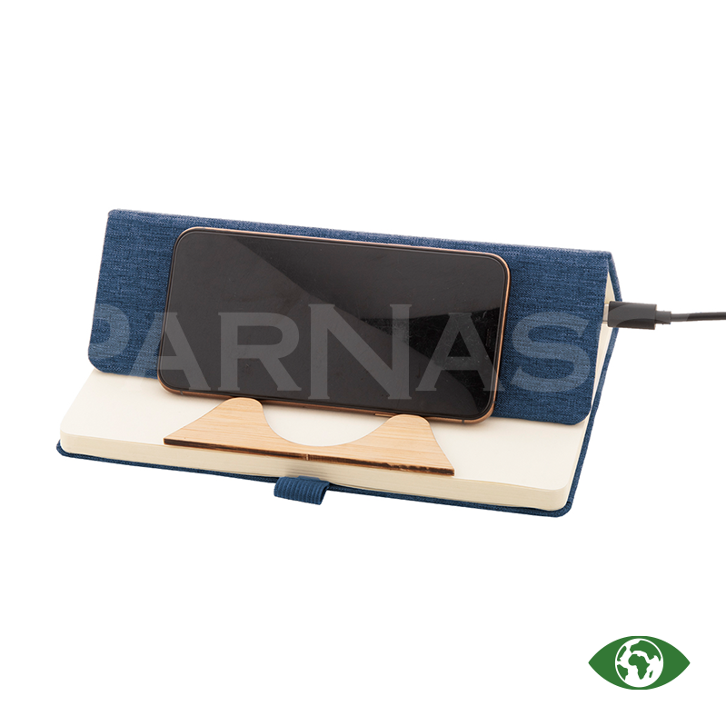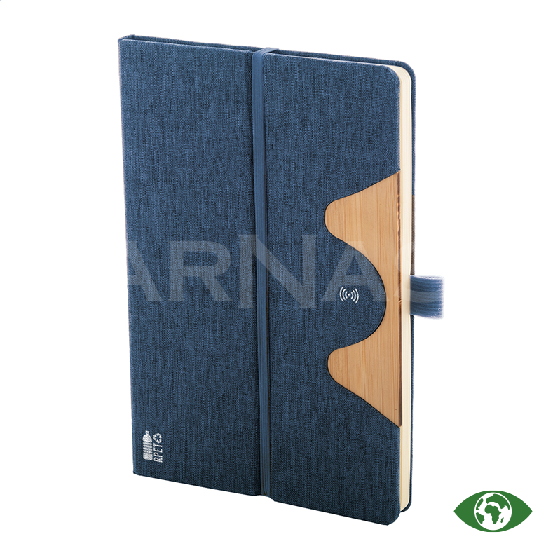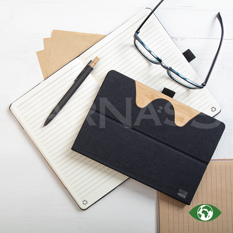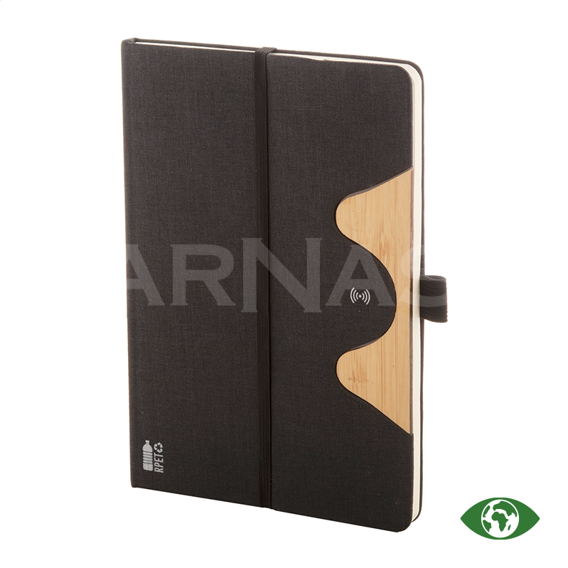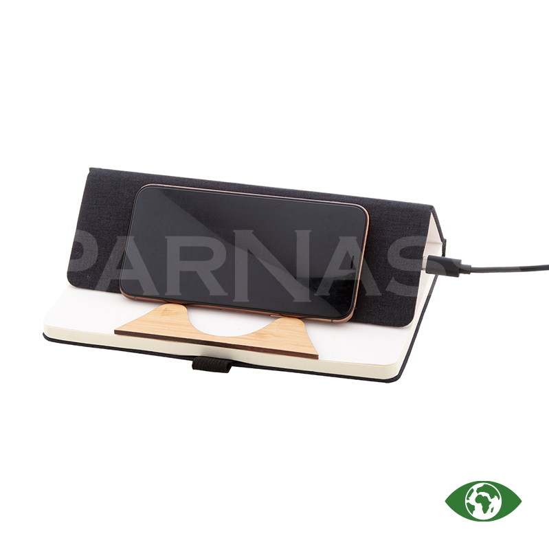 A5 piezīmju bloks ar rPET poliestera vāku un bambusa ielaidumu, ar iebūvētu telefona turētāju un 15W bezvadu ātro lādētāju. 80 līniju pārstrādāta papīra lapas, komplektā USB uzlādes kabelis.