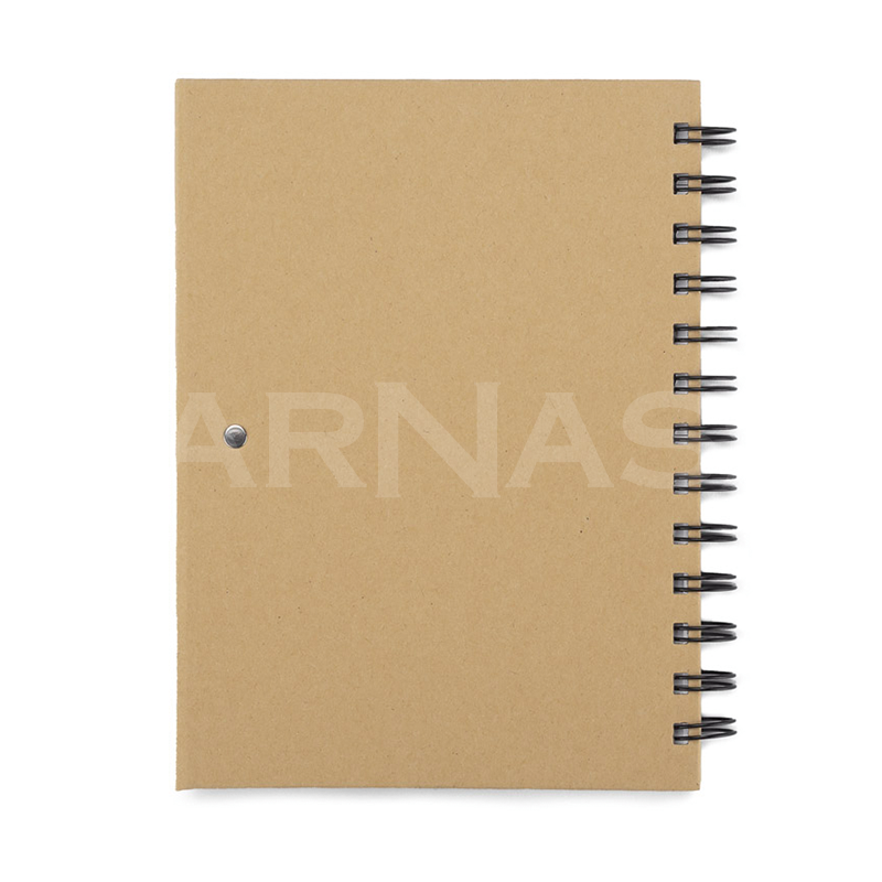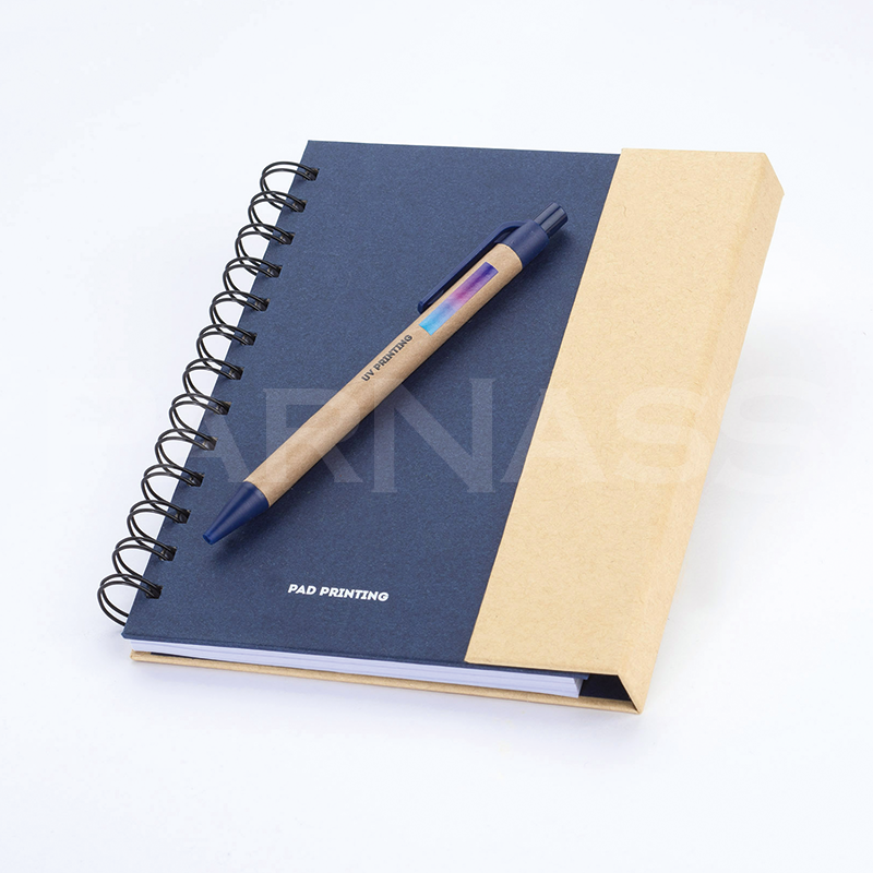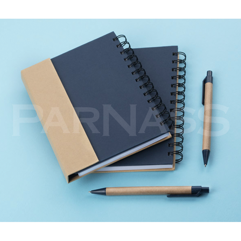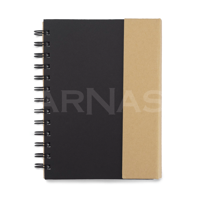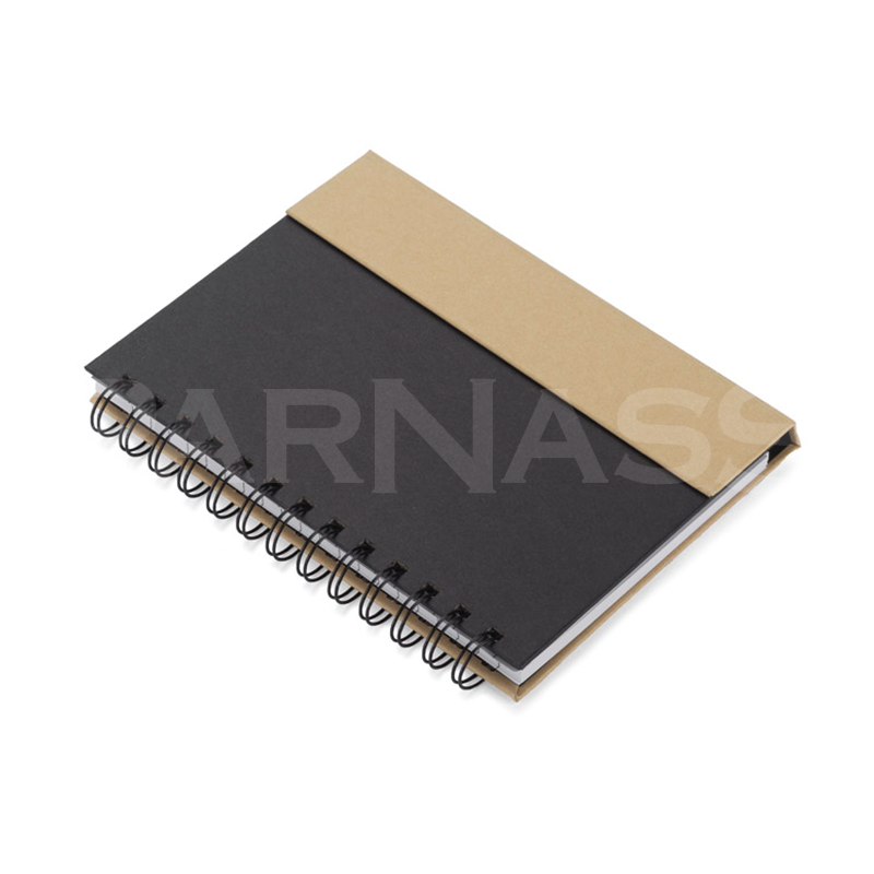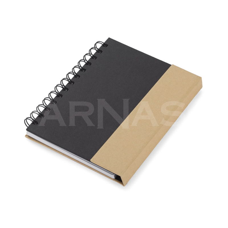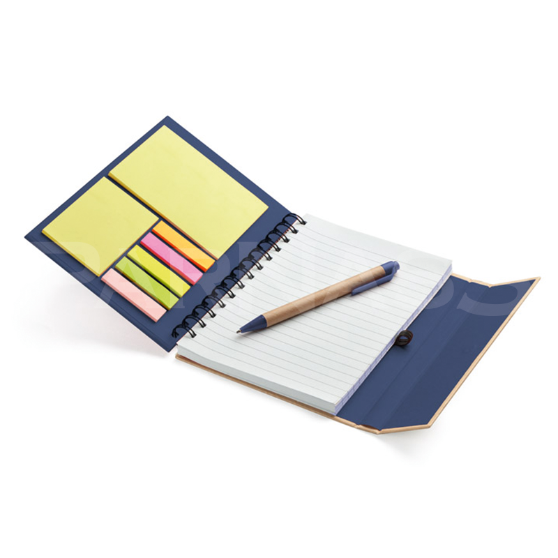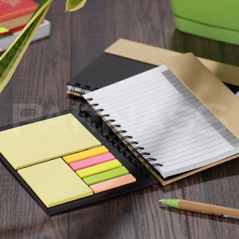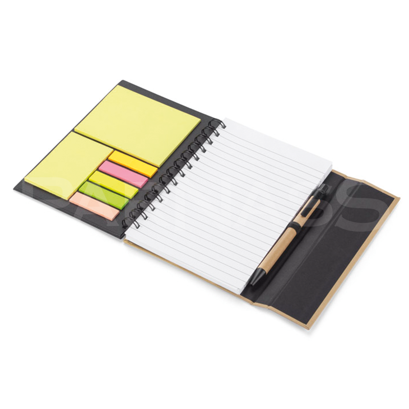 Spirāļots piezīmju bloks ar 70 līniju lapām, dažādu izmēru līmlapiņas, kartona pildspalva.