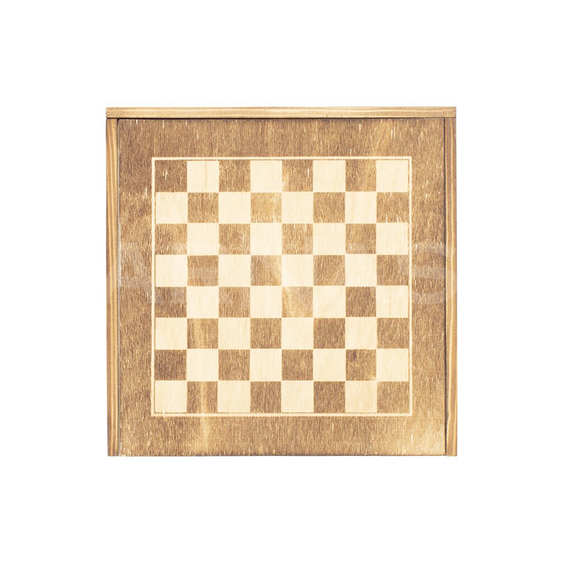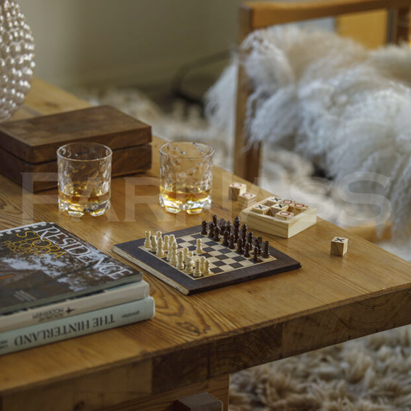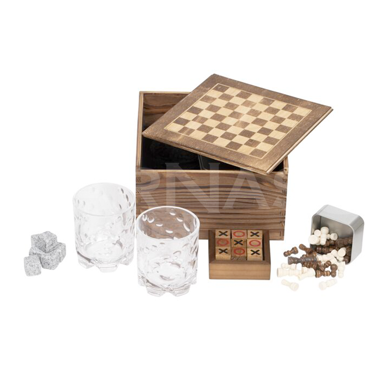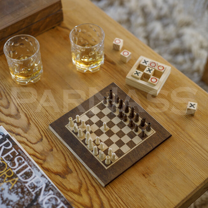 Klasisks spēļu komplekts ar šahu un krustiņu-nullīšu spēli, kā arī divām viskija glāzēm.