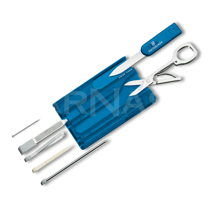 Kompakts VICTORINOX instrumentu komplekts ar 10 funkcijām – asmens, šķērītes, nagu vīlīte, skrūvgriezis 2,5 mm, lineāls (cm), lineāls (collas), adatiņa, pincete, zobu bakstāmais, lodīšu pildspalva.