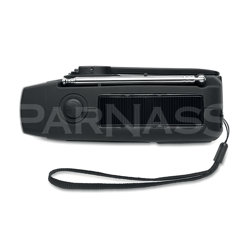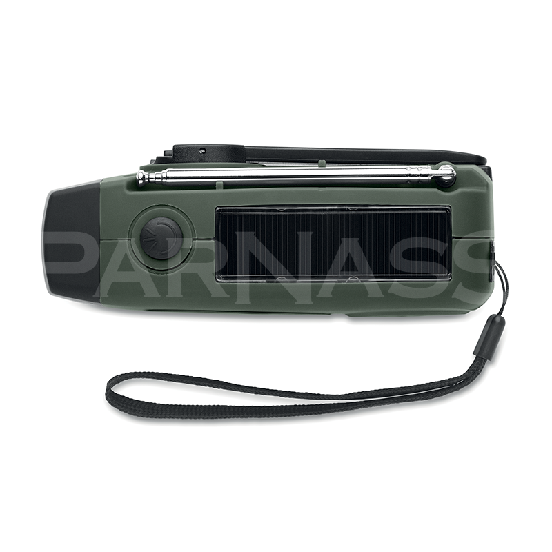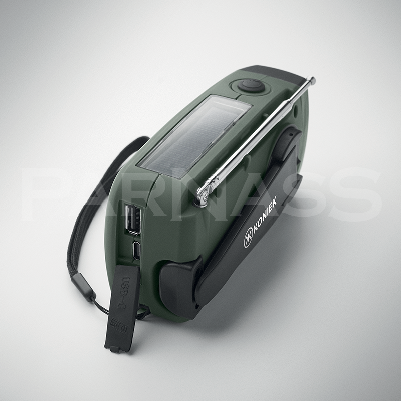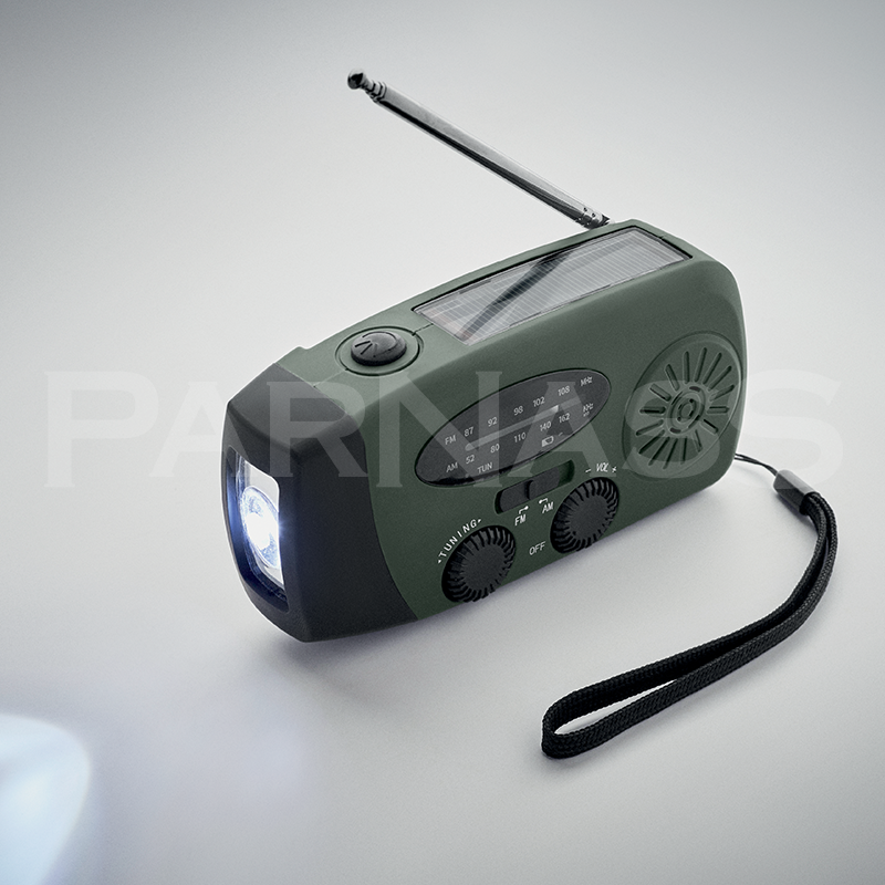 Pārnēsājams AM/FM radio ar LED lukturīti (2 režīmiem) un 1200 mAh akumulatoru mobilo ierīču uzlādei. Darbojas ar saules enerģiju vai rokas ģeneratoru. Daudzfunkcionāls radio, kas izgatavots no izturīga ABS materiāla. Piedāvā plašu noderīgu funkciju klāstu ikdienas lietošanai, aktivitātēm brīvā dabā vai ārkārtas situācijām. Komplektā ietilpst: divjoslu radio FM/AM; LED lukturītis ar SOS režīmu; saules uzlādes panelis; manuāla uzlāde ar 360° regulējamu dinamo sistēmu; 1200 mAh uzlādējams akumulators; augstas jutības salokāma antena; C tipa ieeja un USB izeja. Darbojas ar saules enerģiju vai rokas ģeneratoru.