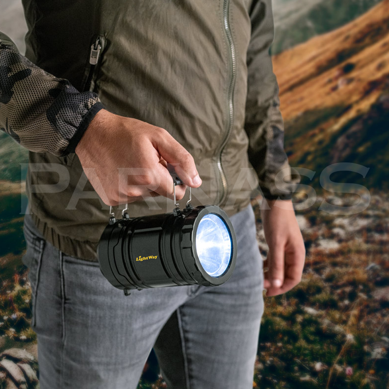 2 vienā laterna ar diviem lietošanas režīmiem – kā āra vai kempinga lampa plašākam apgaismojumam, vai kā lukturis, izmantojot noņemamo sānu rokturi. Aprīkota ar COB LED (200 lūmeni) un 1 W LED (70 lūmeni). Ideāli piemērota kempingam un āra aktivitātēm. Komplektā – 3 AA baterijas.