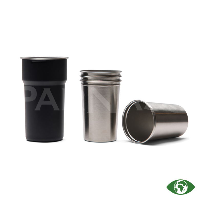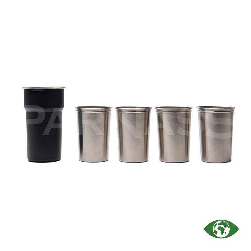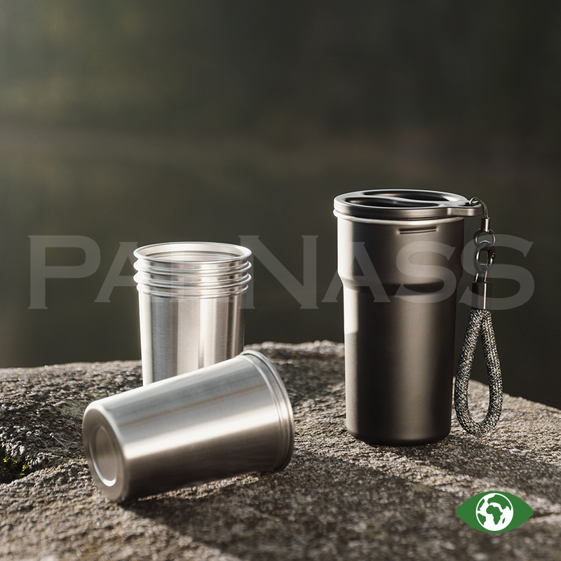 Praktisks piknika krūzīšu komplekts no pārstrādāta nerūsējošā tērauda. Četras 250 ml krūzes ievietotas vienā 450 ml krūzē ar ērtu rokturi — kompakti un viegli paņemams līdzi. Izgatavots no 79% RCS sertificēta pārstrādāta tērauda. Mazgāt ar rokām.