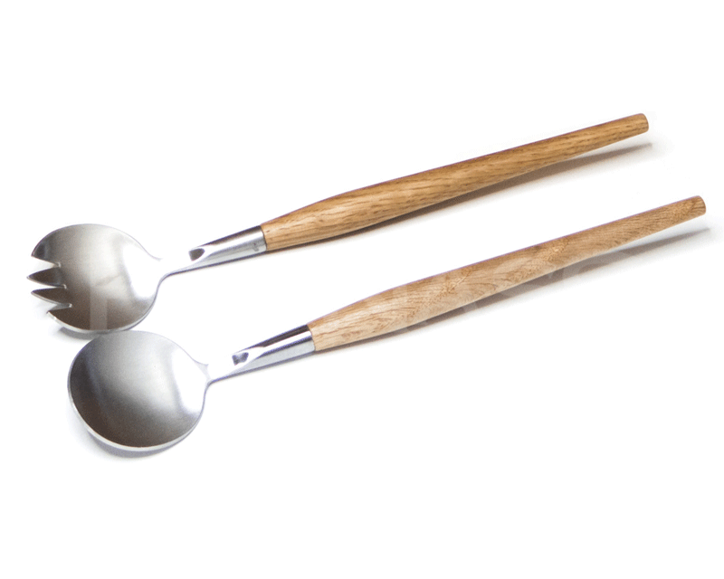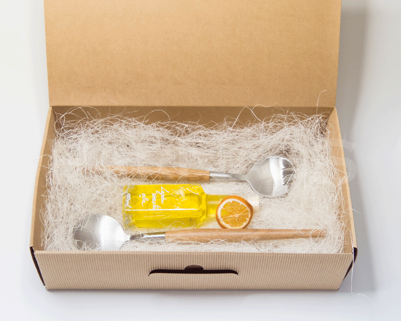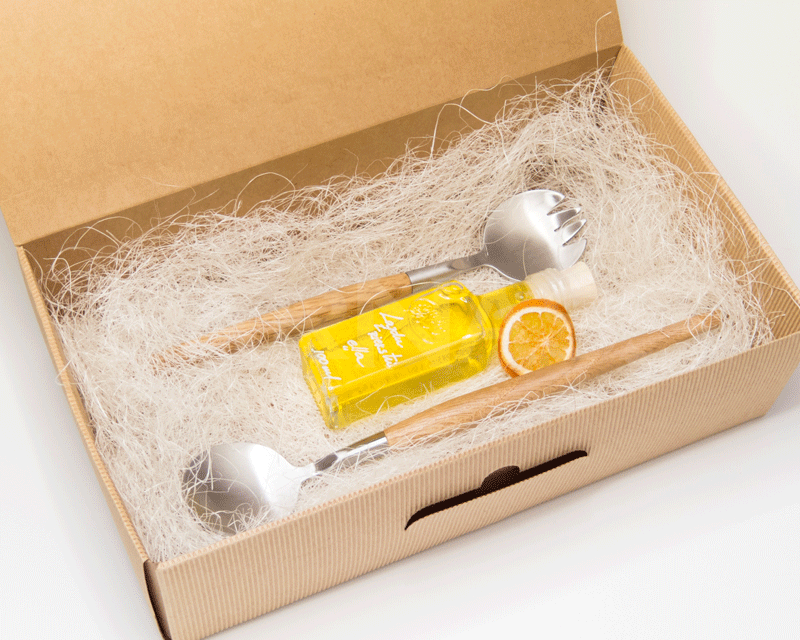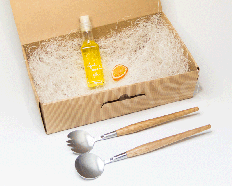 Dāvanu komplekts - salātu karotes RETRO; ladzu riekstu eļļa VomFass; floristikas materiāls - sizals un kaltēta apelsīnu šķēlīte; gofrētā kartona kārba, izmērs: 32x19x9cm. Apstrādes veids: gravējums uz karotēm. Kasti var pārsiet ar sizalu vai satīna lentu.