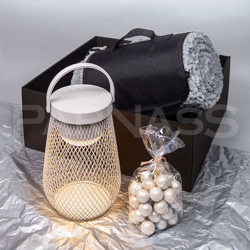 • Dražejas ALMARIANNI 160 g • Piknika sēžampleds PŪKAINIS • Galda lampa AURORA • Kartona kārbaar vāku 31x31x12 cm