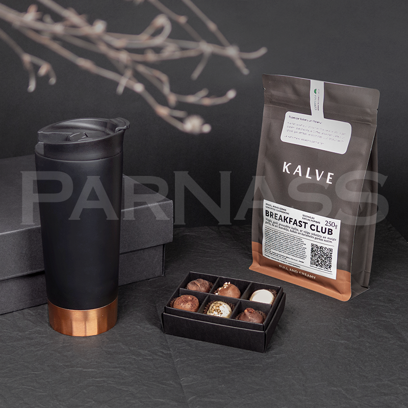 • Termokrūze PEETA COPPER • Kafija KALVE 250 g • Šokolādes trifeles • Dekoratīvas papīra strēmeles • Kartona kārba ar vāku 37x26x9,5 cm