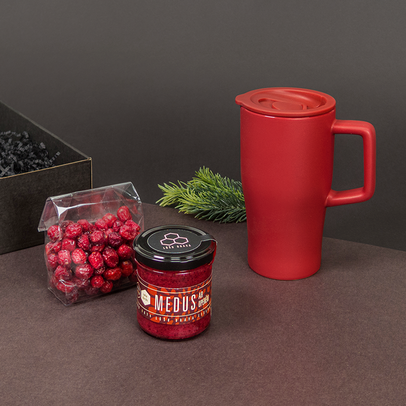 • Lūšu dravas medus ar upenēm, 190 g • Rāmkalnu dzērvenes, 100 g • Keramikas krūze LUXE QUENCHER, 490 ml • Dekoratīvas papīra strēmeles • Kartona kārba ar vāku 25x25x8,5 cm