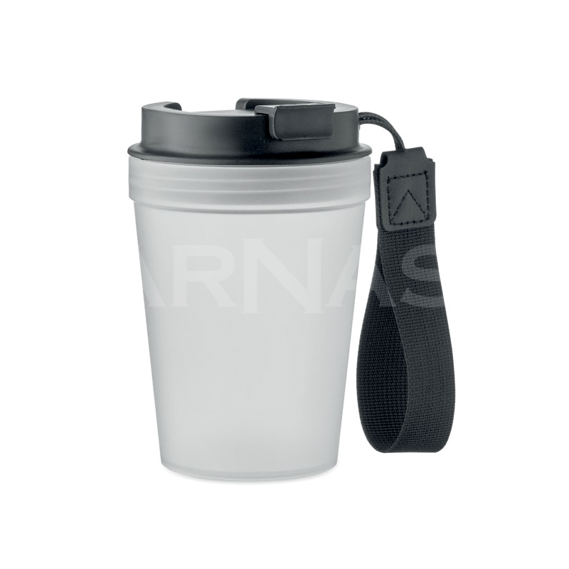 Vienas sienas PP (polipropilēna) krūze ar RPET siksniņu. Hermētiska, tilpums – 300 ml. Tā kā glāzei ir tikai viena siena, tā var uzkarst no karsta dzēriena.