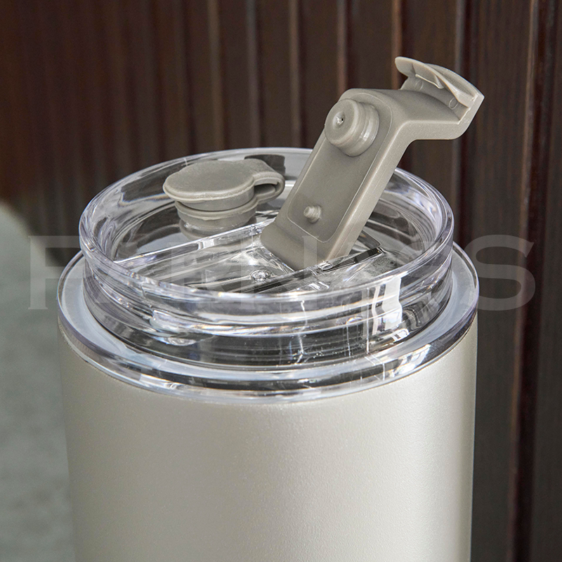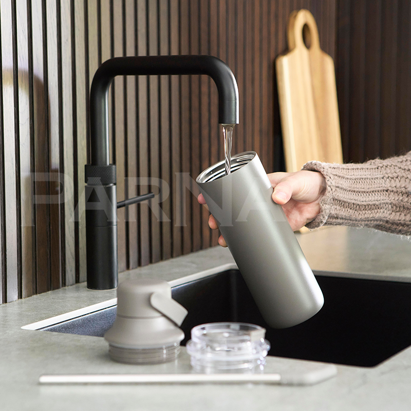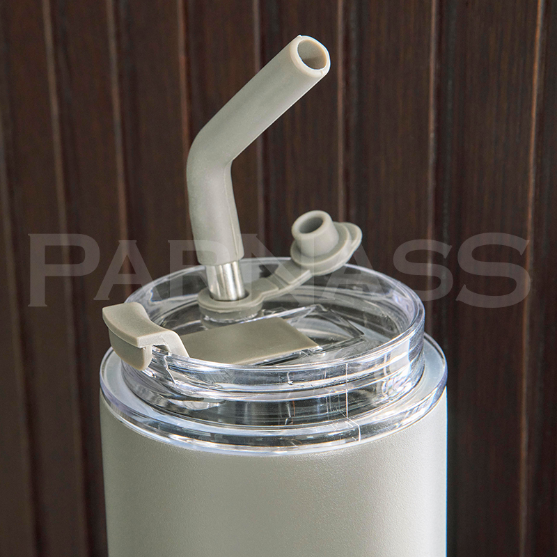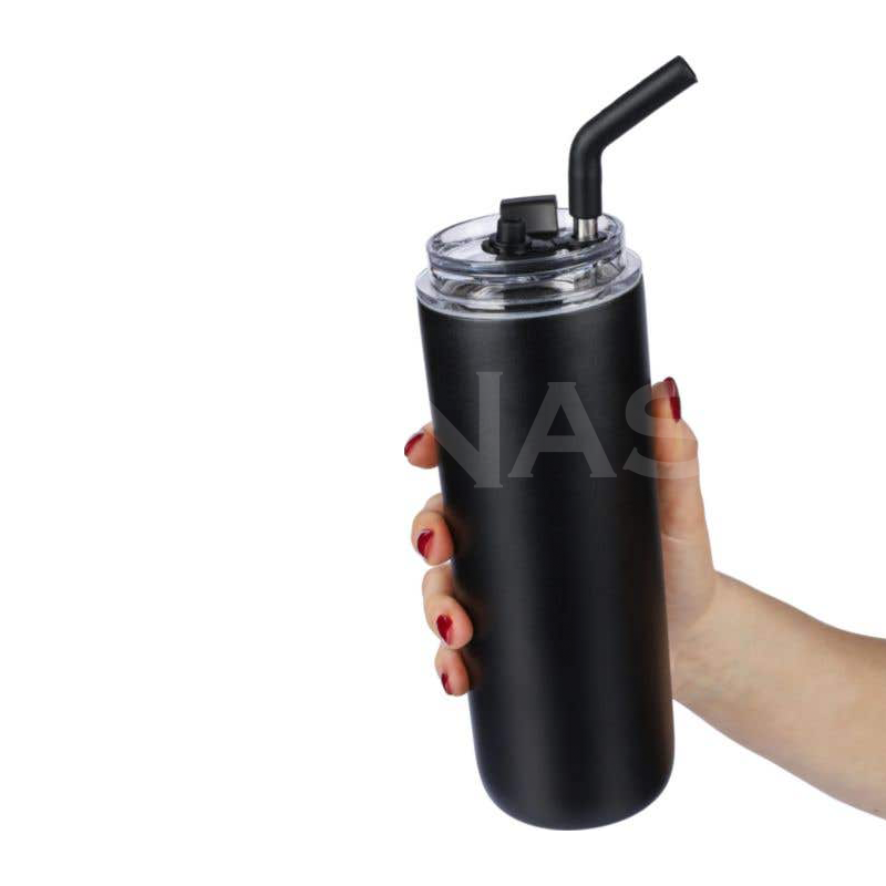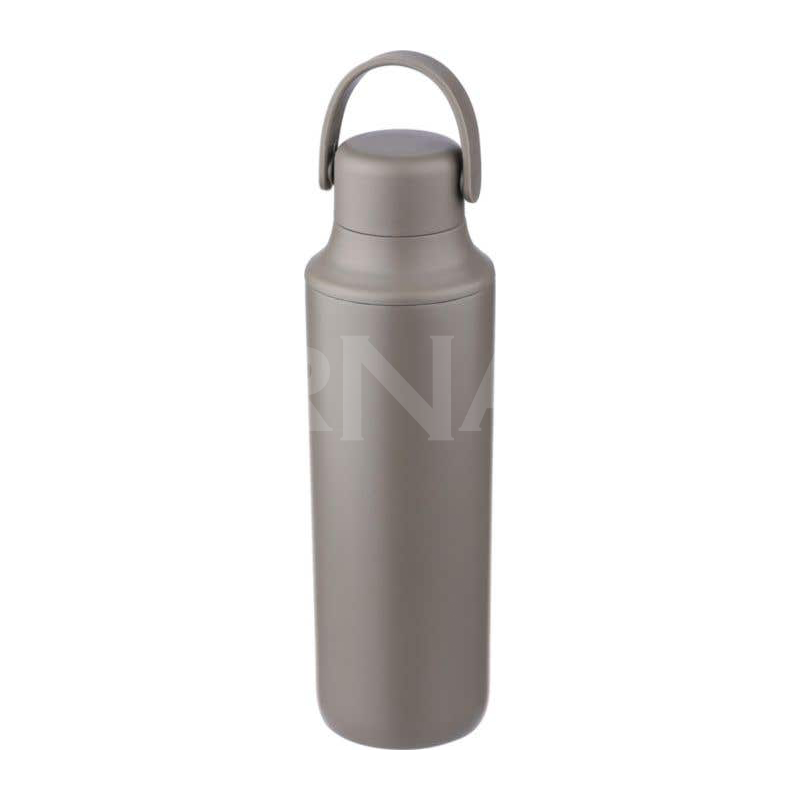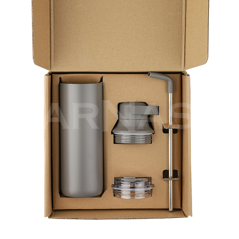 Nerūsējošā tērauda dubultsienu pudele. Komplektā ietilpst divi vāki: ​​PP vāks ar rokturi pārnēsāšanai un caurspīdīgs PS vāks lietošanai ar komplektā iekļauto nerūsējošā tērauda salmiņu ar silikona uzgali un turētāju. Iepakota brūnā kartona kastē.