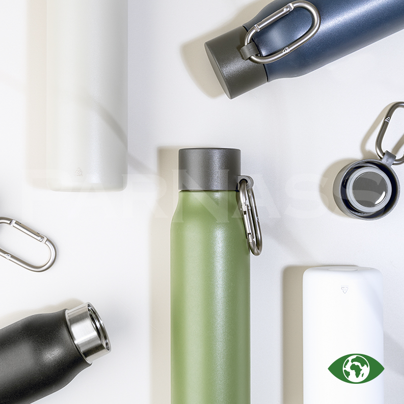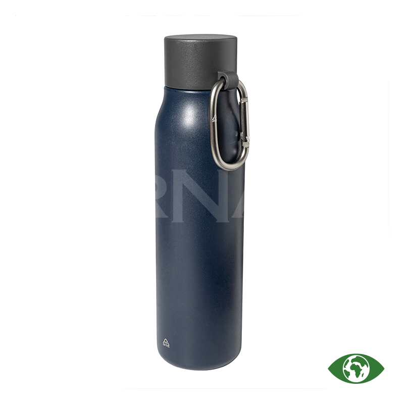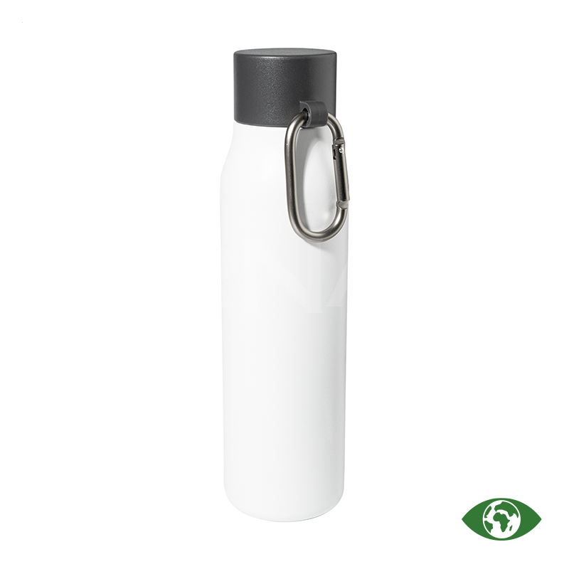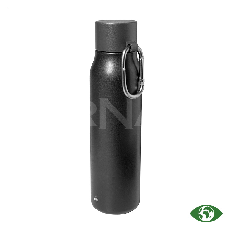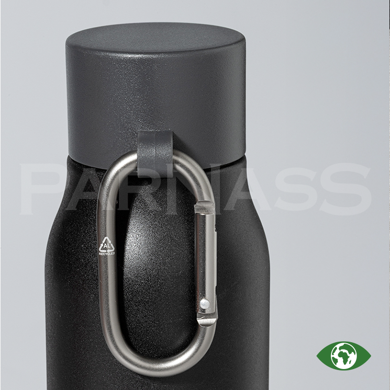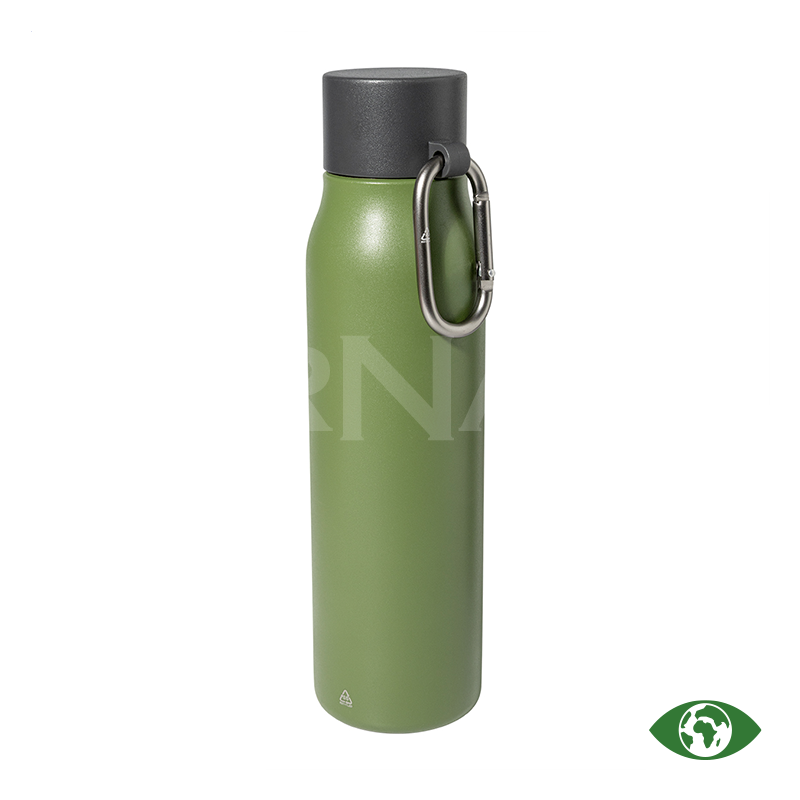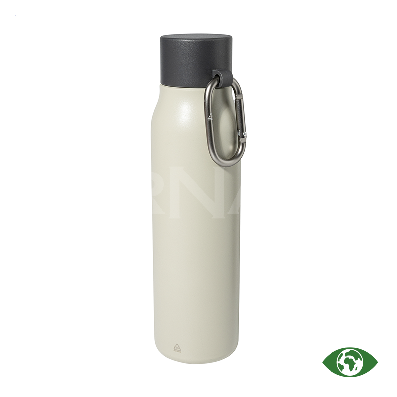 Divsienu, pārstrādāta nerūsējošā tērauda vakuuma izolēta pudele ar PP vāku un pārstrādāta alumīnija karabīni.