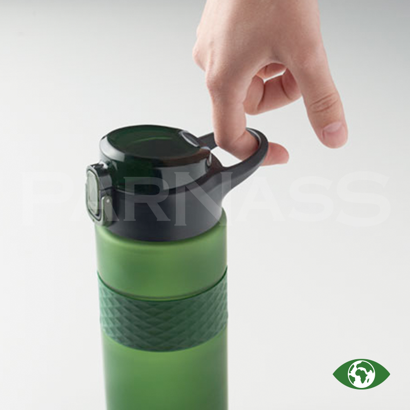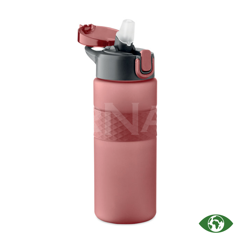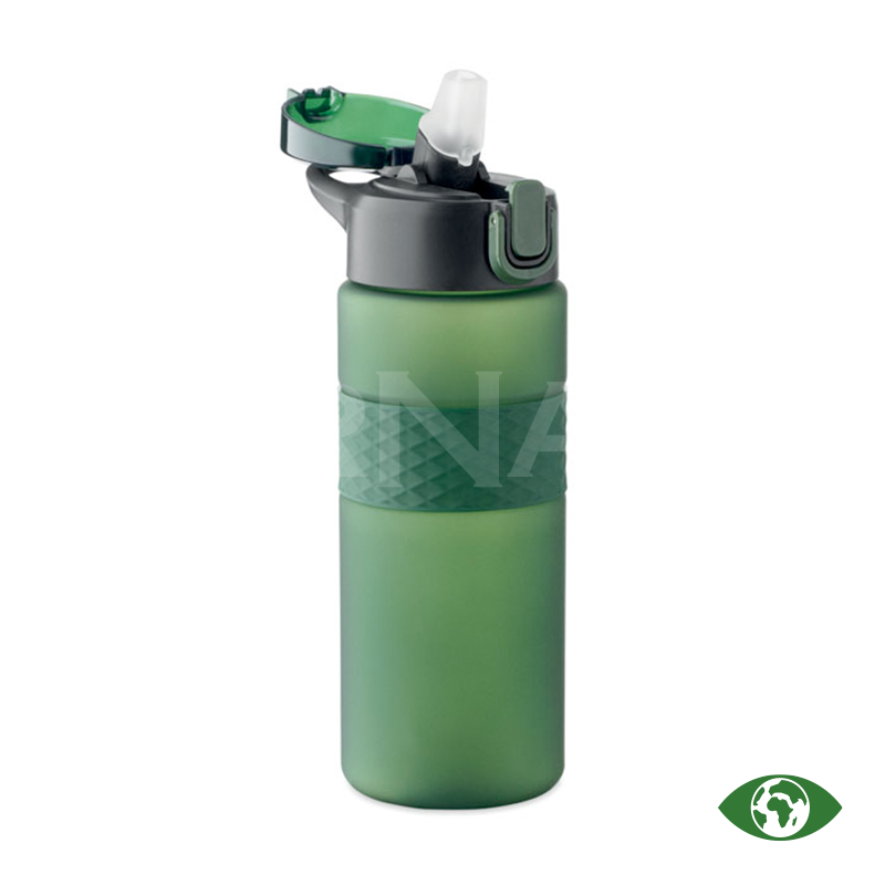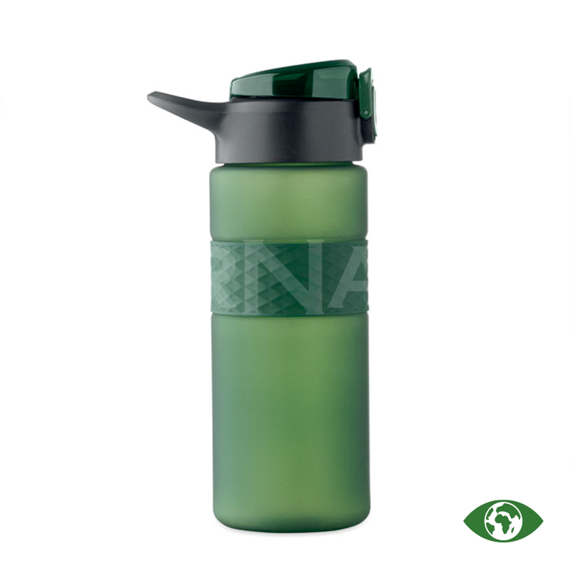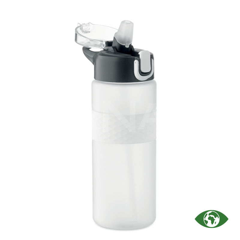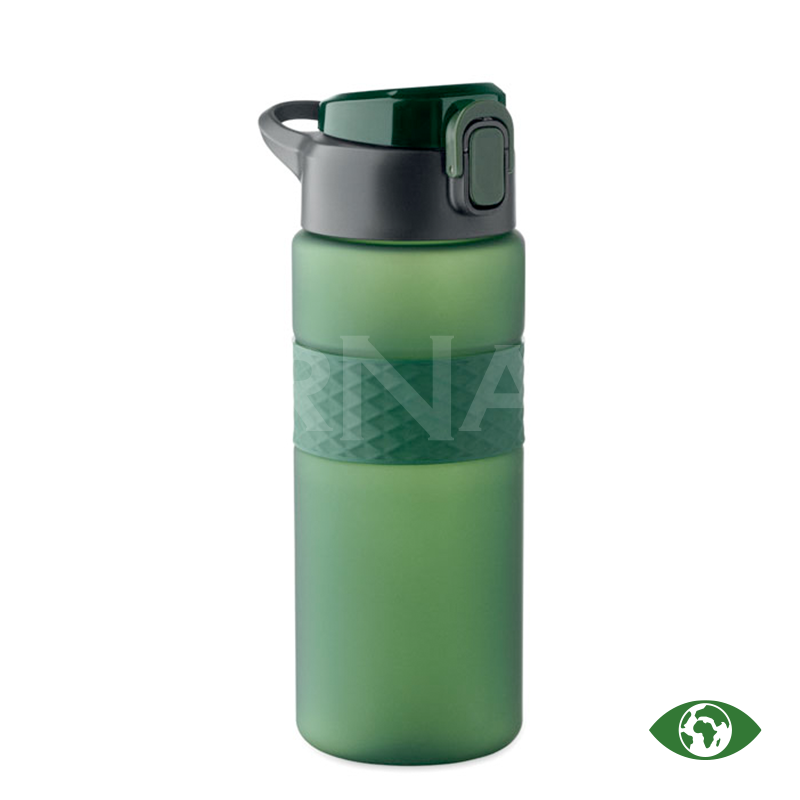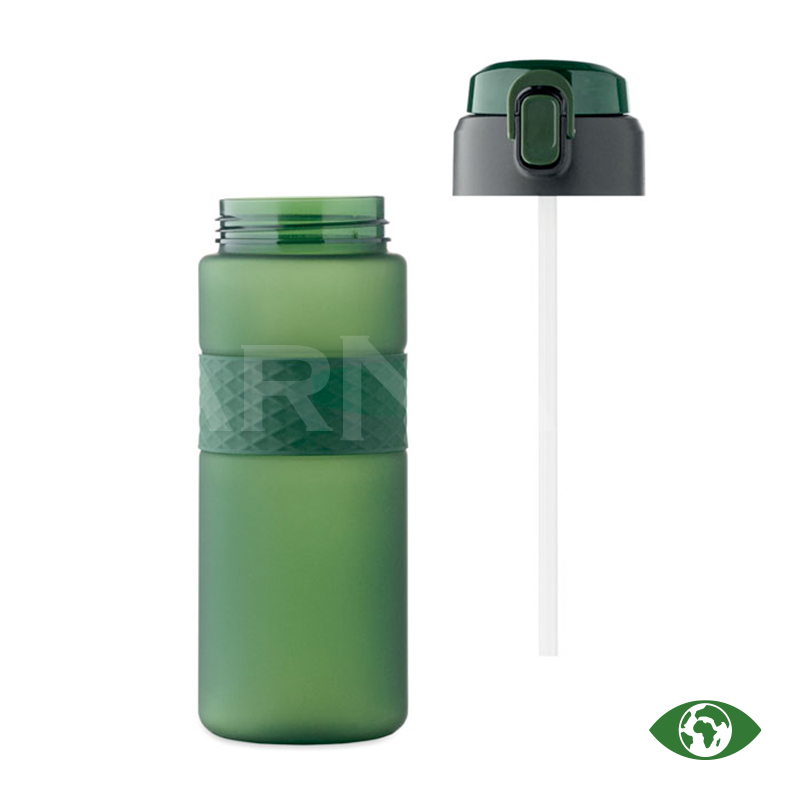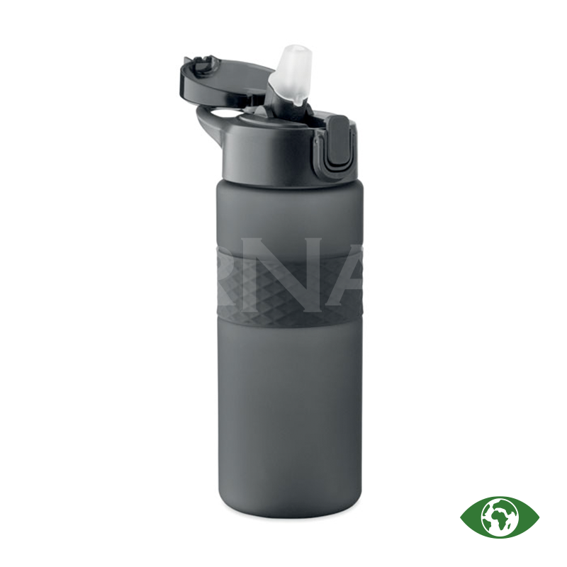 Ūdens pudele no pārstrādāta PET ar silikona rokturi ērtai nešanai, PP plastmasas vāku un drošības aizdari. Iebūvēta salmiņa sistēma, hermētiska.
