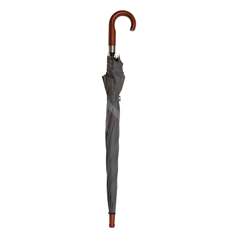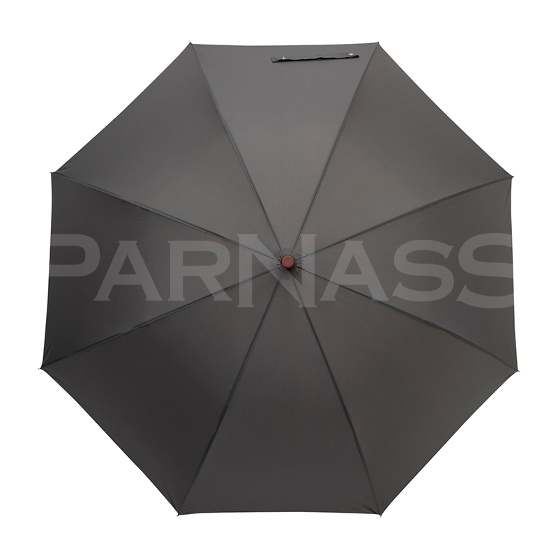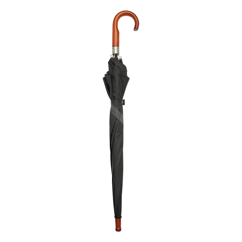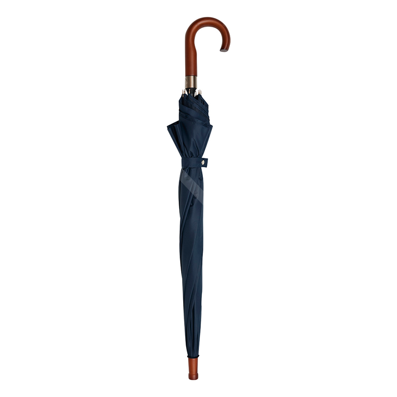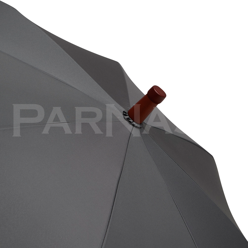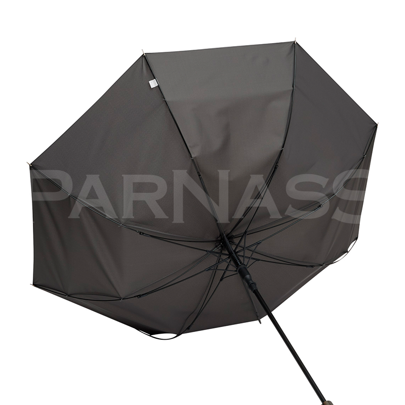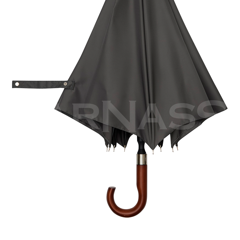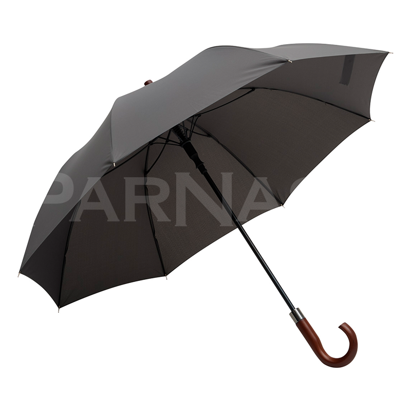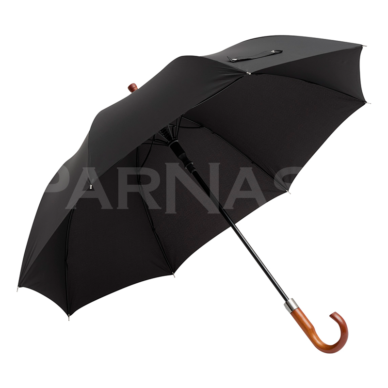 Automātiskais golfa lietussargs ar melnu metāla kātu, stikla šķiedras spieķiem, koka rokturi, koka augšdaļu un augstas kvalitātes poliestera pārsegu.