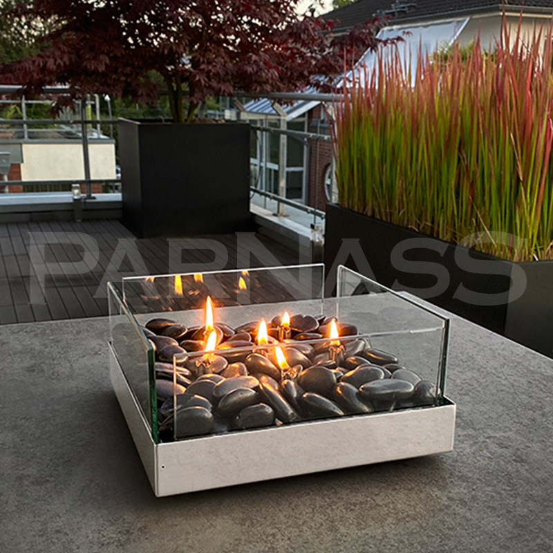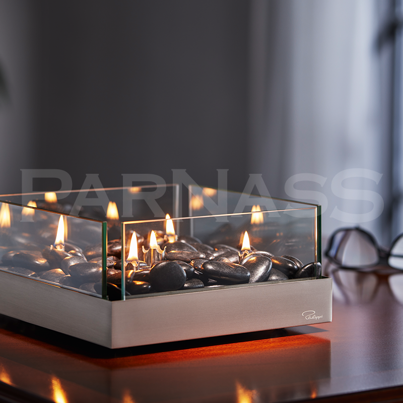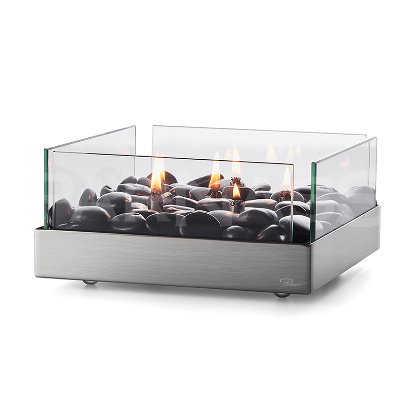 Dizania galdas kamīns, kas izgatavots no augstas kvalitātes nerūsējošā tērauda un stikla. 100% roku darbs. Ar pievienoto piltuvi un šļūteni uzpildāms ar petrolejas eļļu.