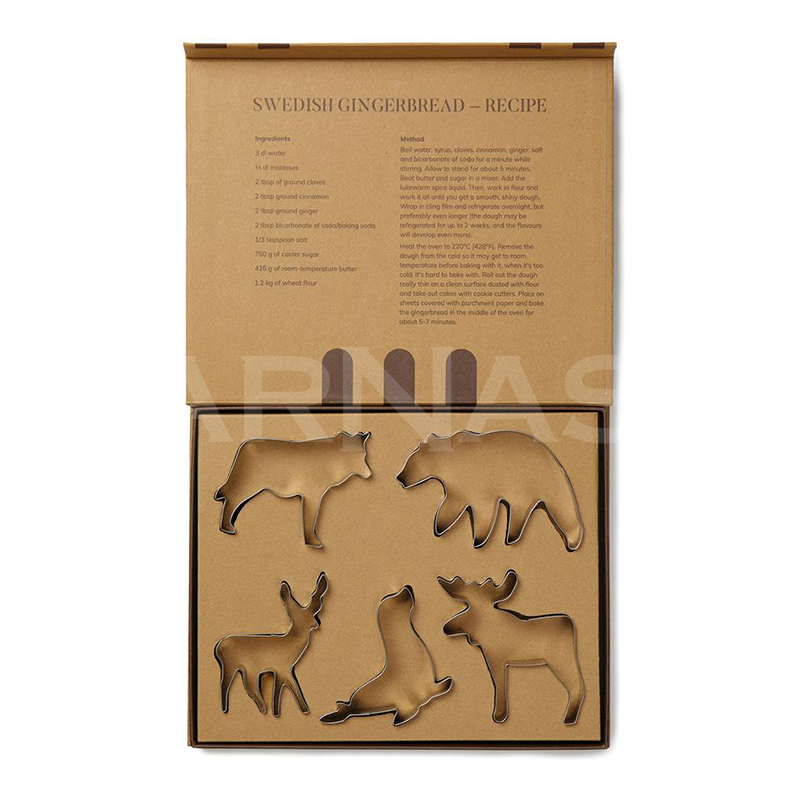 Sajūtiet Ziemeļvalstu gaisotni, izmantojot mūsu 5 formīšu komplektu, kas izgatavots no augstākās kvalitātes nerūsējošā tērauda. Piecas atšķirīgas Skandināvijas dzīvnieku formas. Izturīgasi un viegli tīrāmas formītes ar asām malām. Iepakota dāvanu kastītē, uz kastītes iekšējā vākā ir zviedru ingvera cepumu recepte, piešķirot jūsu cepšanas piedzīvojumiem autentisku skandināvu pieskārienu. Iespējama druka uz kastes vāka.