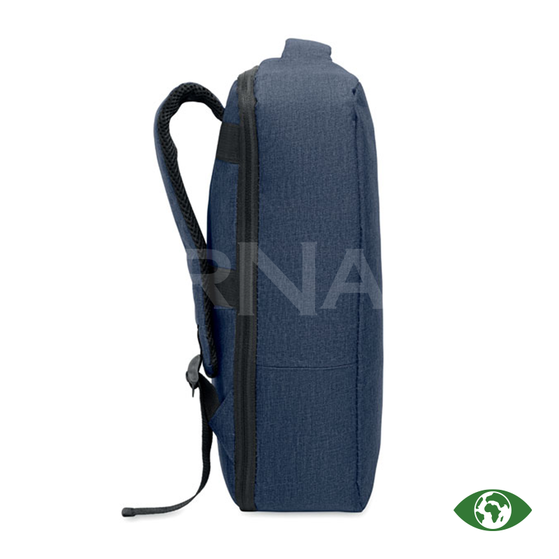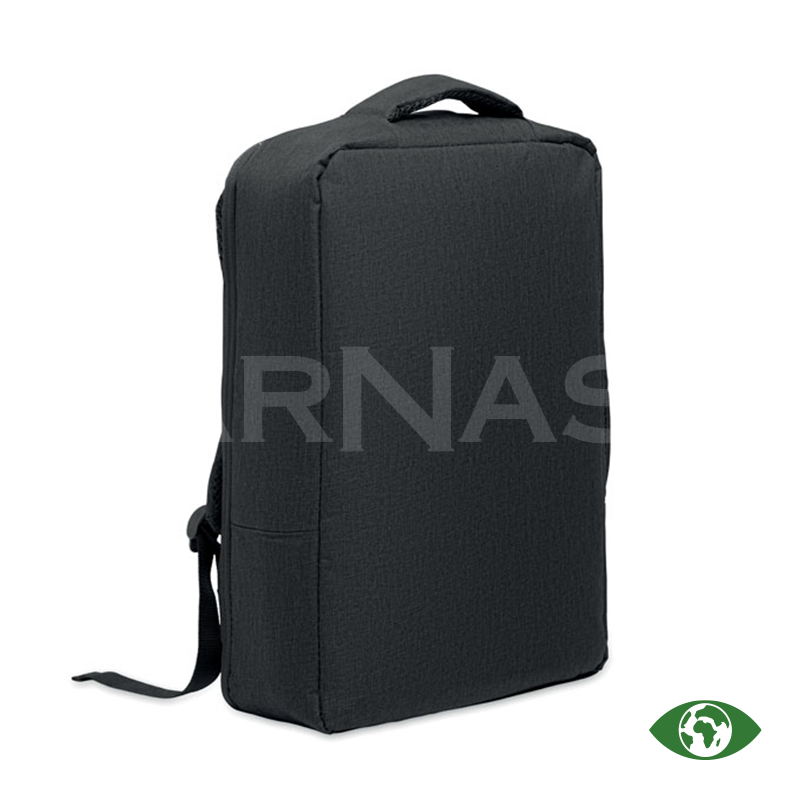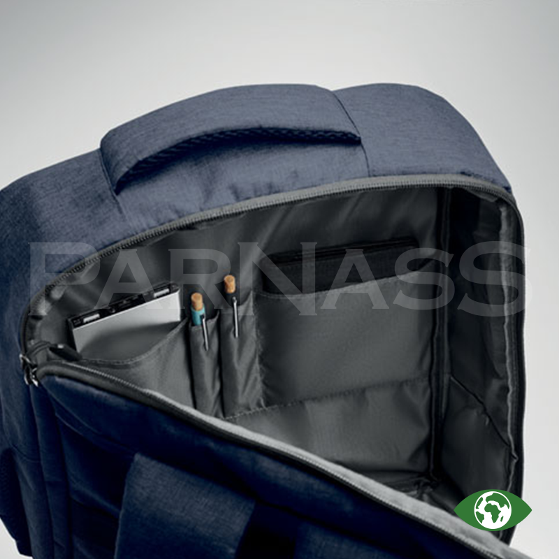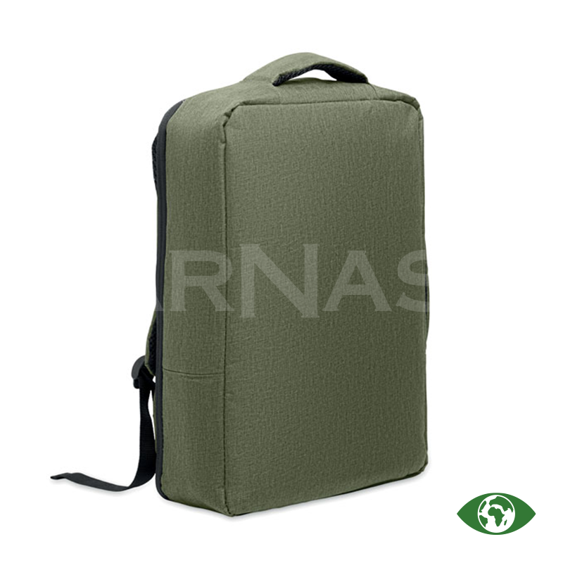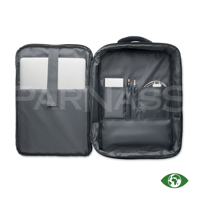 No otrreiz pārstrādāta PET izgatavota klēpjdatora mugursoma ar 180 grādu atvēršanu. Somai ir 15 collu klēpjdatora nodalījums, 2 iekšējās kabatas, 2 iekšējās pildspalvu kabatas un 2 polsterēti rokturi. Mīkstas, polsterētas muguras un plecu siksnas.
