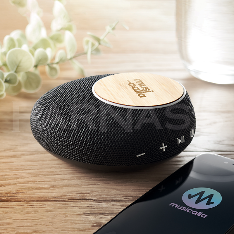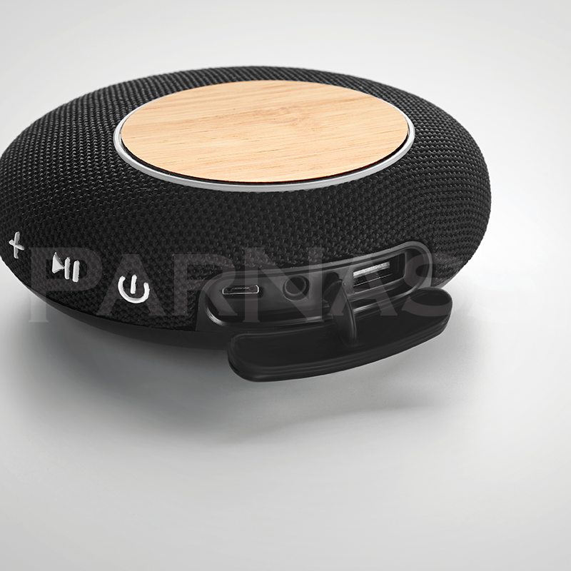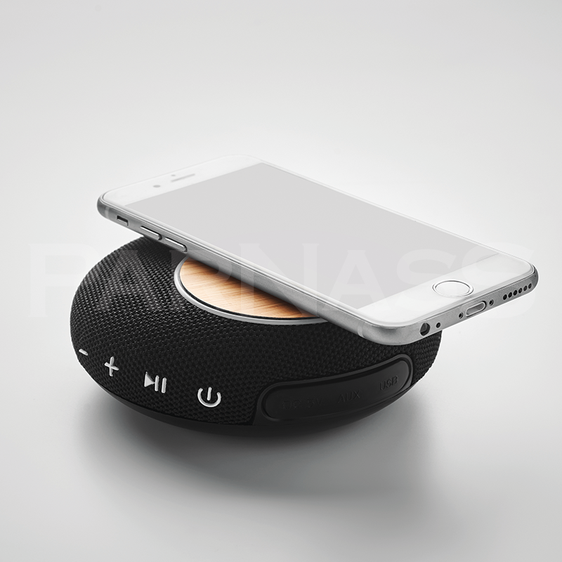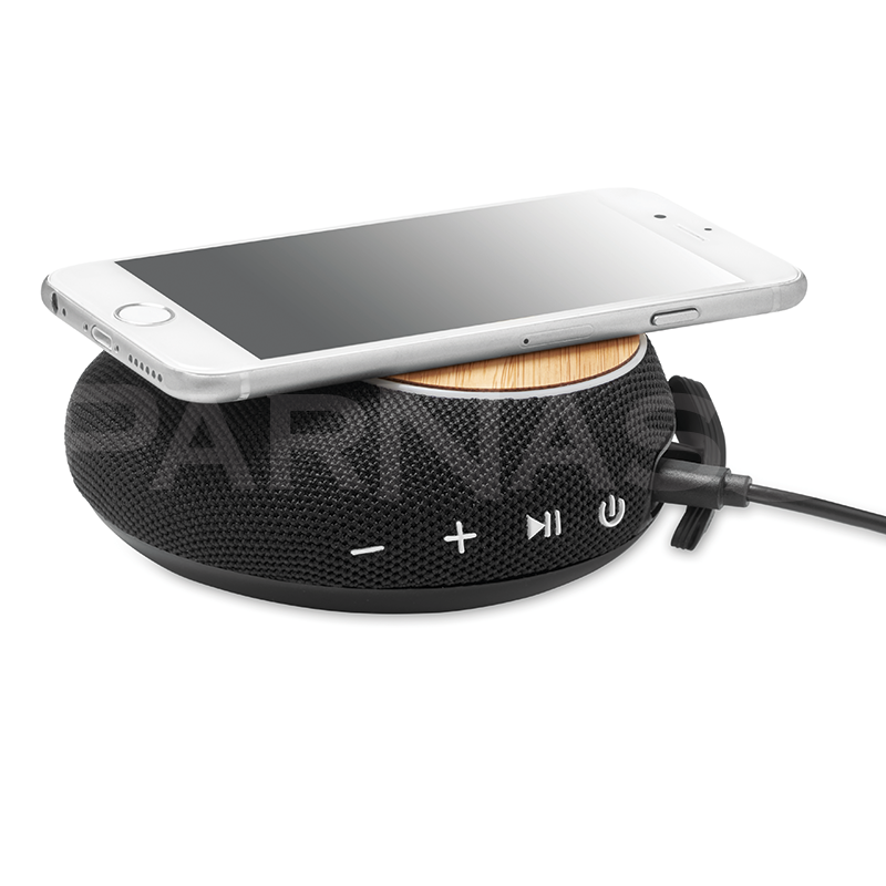 BT 5.0 bezvadu skaļrunis ABS korpusā un bambusa augšpusē. Tam ir arī iebūvēts 10 W bezvadu lādētājs, lai uzlādētu viedtālruni, un 4000 mAh akumulators. Izeja DC 9V/1.1A. Bambuss ir dabisks produkts, katrai precei var būt nelielas krāsas un izmēra atšķirības, kas var ietekmēt gala apdares rezultātu.