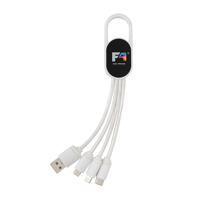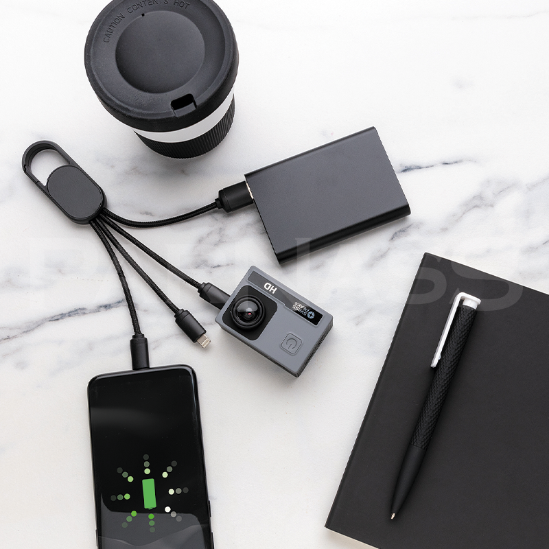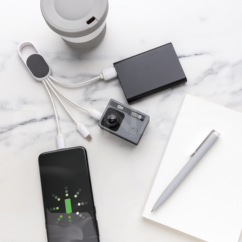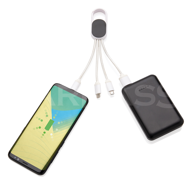 4 vienā uzlādes kabelis ar karabīni. USB ievades spraudnis un izvadei: divpusējs savienotājs IOS ierīcēm, mikro USB un C tipa izeja. Piemērots visu izplatīto mobilo ierīču uzlādei. ABS materiāla korpuss ar 10 cm gariem neilona pītiem kabeļiem. Atbalsta uzlādi līdz 2.1A